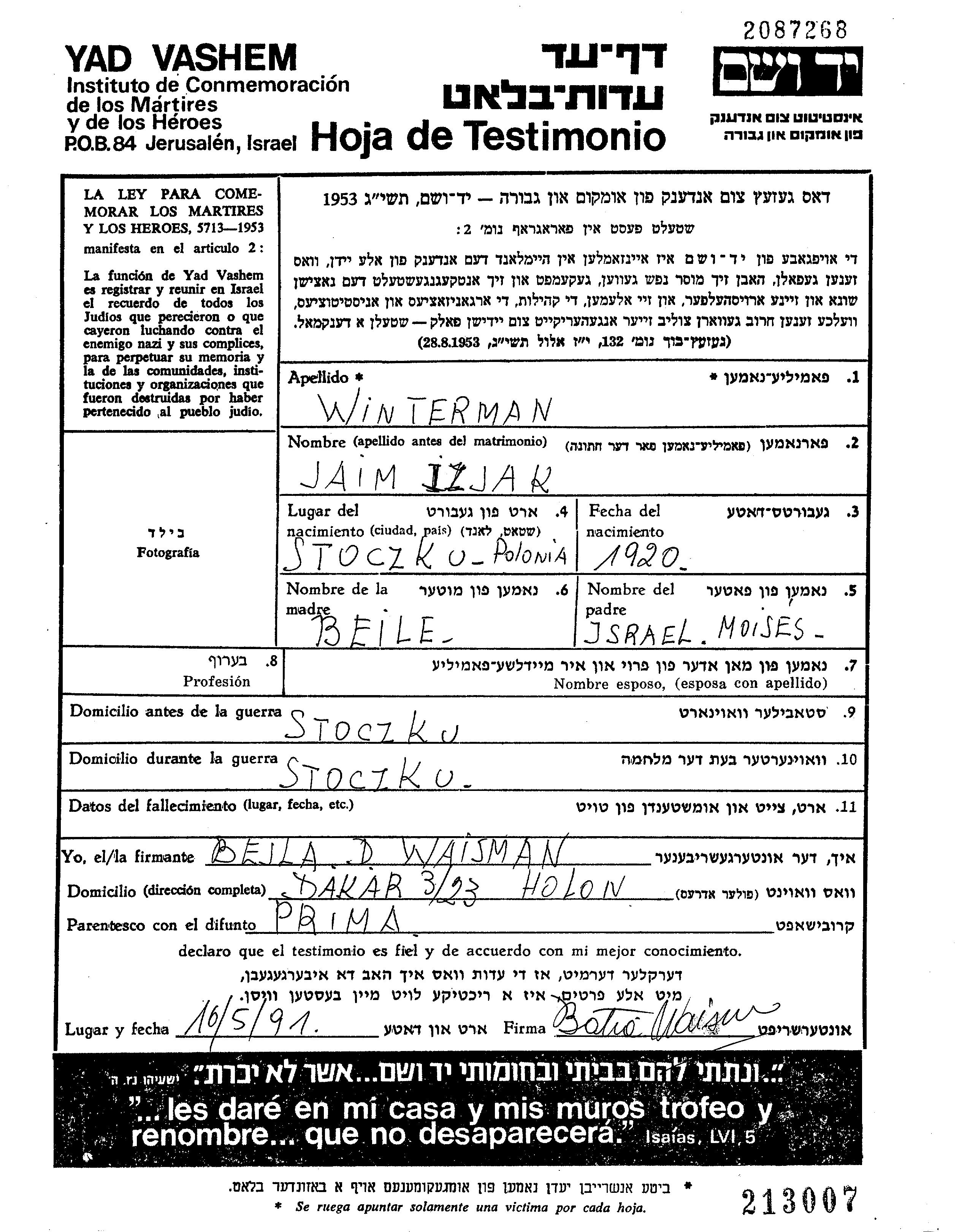 Jaim Izjak Winterman wurde im Jahr 1920 in Stoczek, Polen geboren. Er war der Sohn von Israel Moises und Beile, geb. Kijak. Vor dem Zweiten Weltkrieg lebte er in Stoczek, Polen. Während des Krieges war er in Stoczek, Polen.