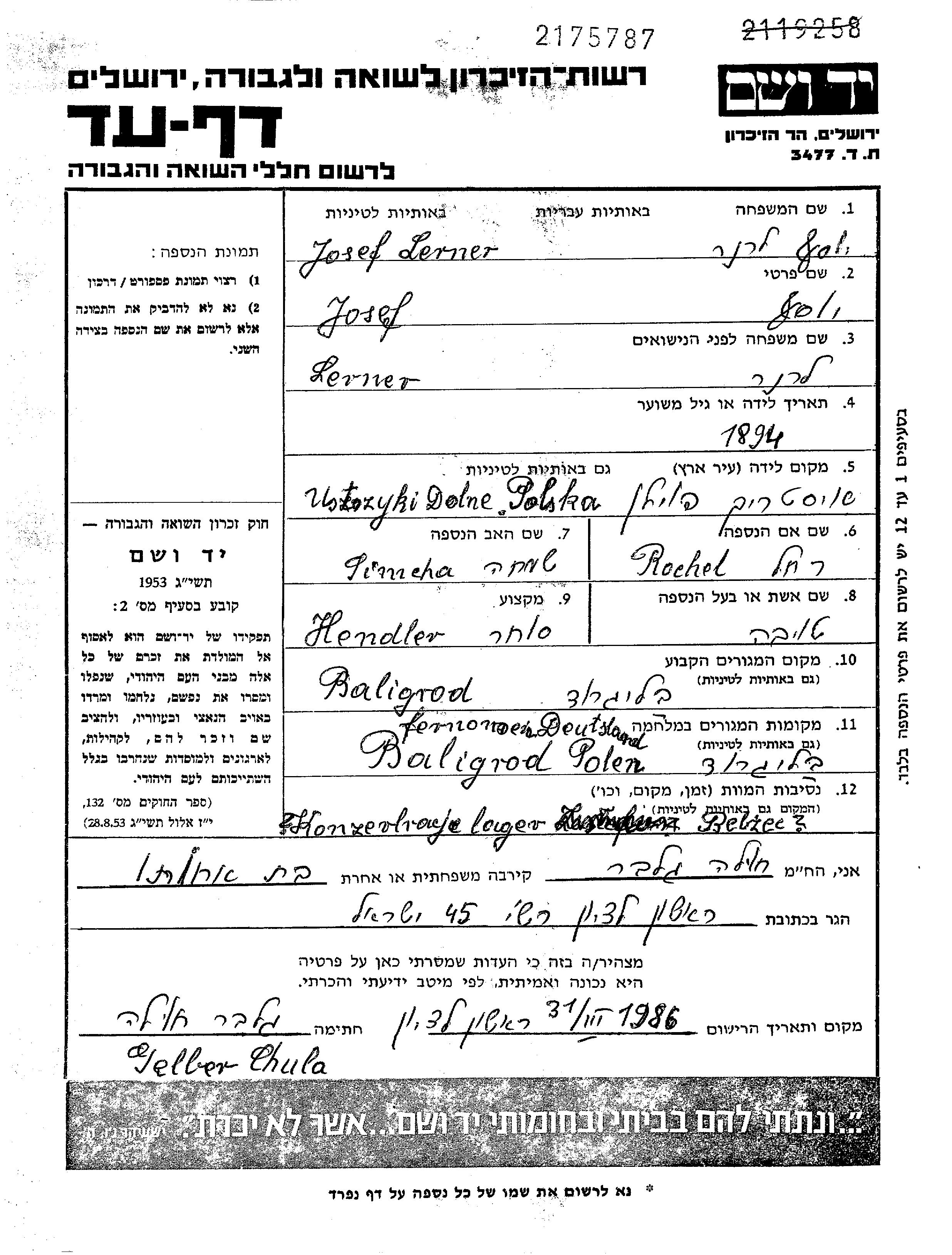 Yosef Lerner wurde im Jahr 1894 in Ustrzyki Dolne, Polen geboren. Er war der Sohn von Simca und Rochel. Er war Kaufmann/-frau und mit Touba Tova Verheiratet. Vor dem Zweiten Weltkrieg lebte er in Baligrod, Polen. Während des Krieges war er in Baligrod, Polen.