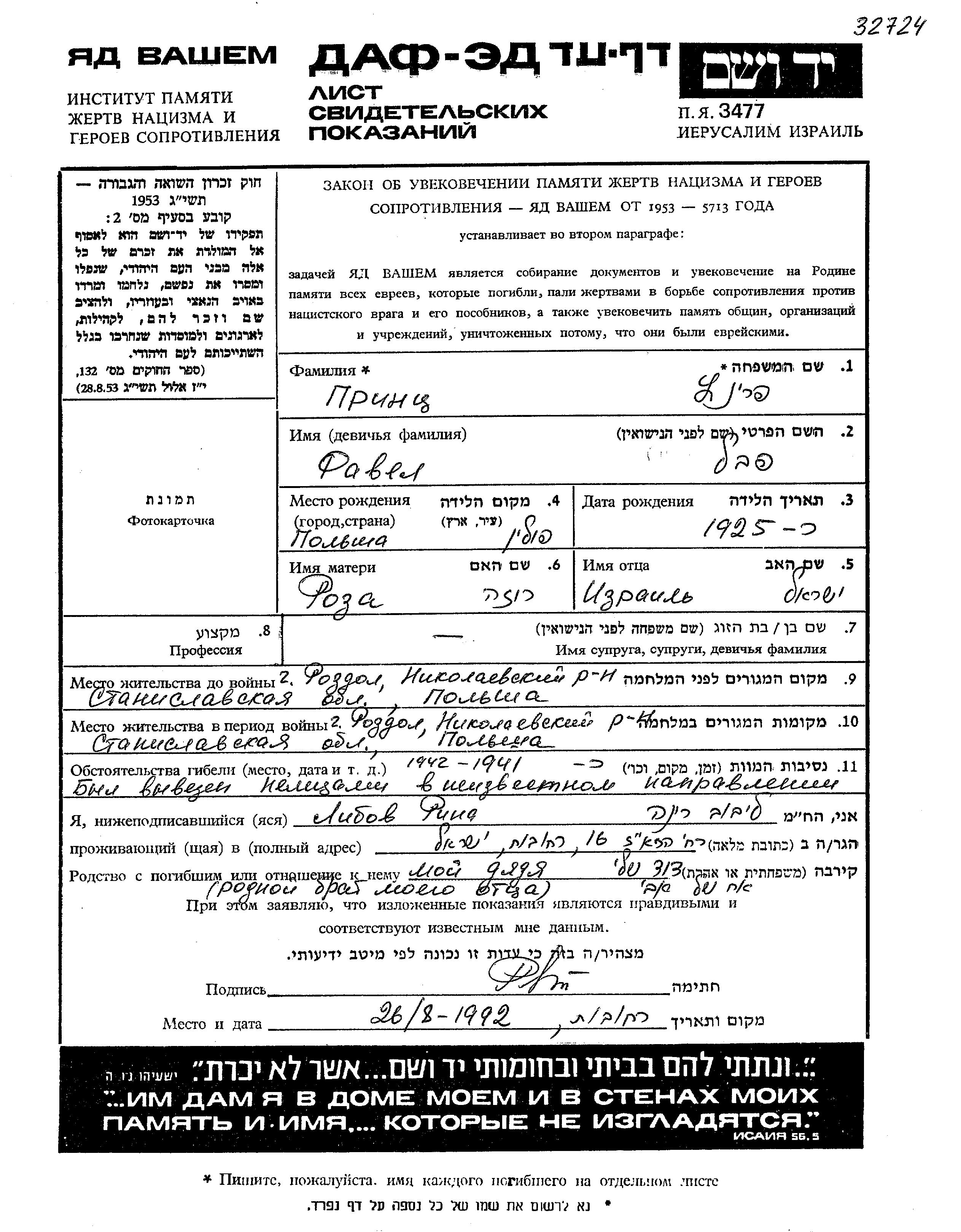 Favel Pavel Printz wurde im Jahr 1925 in Polen geboren. Er war der Sohn von Izrail und Roza, geb. Diamant. Er war Kind. Vor dem Zweiten Weltkrieg lebte er in Rozdol, Polen. Während des Krieges war er in Rozdol, Polen.