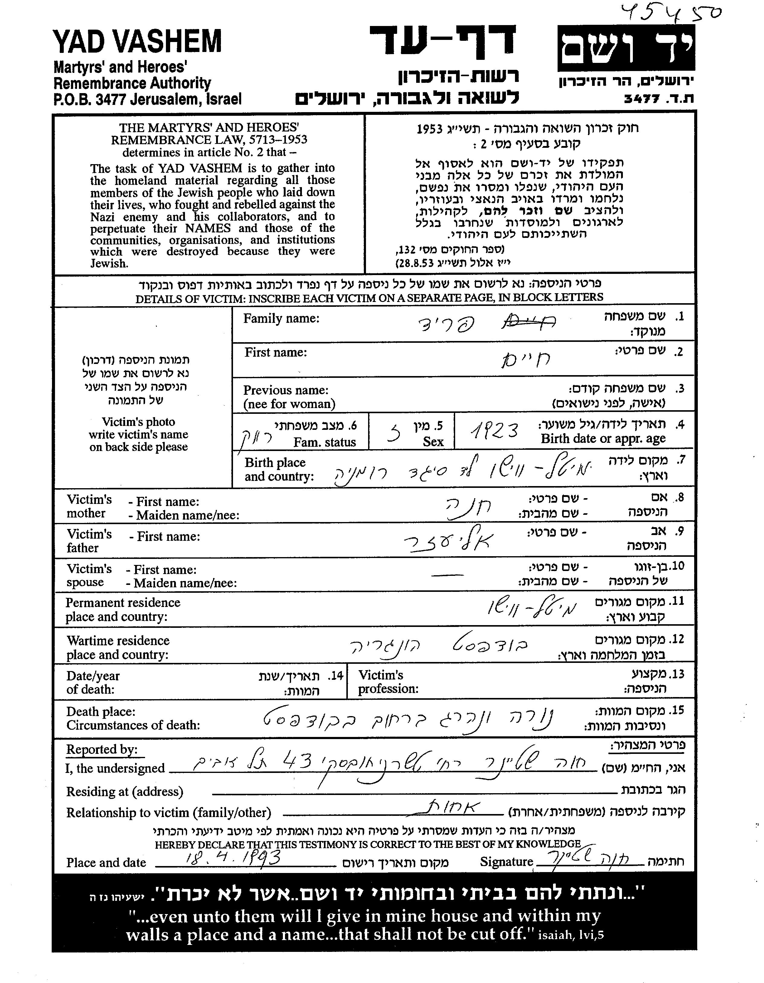 Khaim Frid wurde im Jahr 1923 in Mitel Wisho, Rumänien geboren. Er war der Sohn von Eliezer und Khana, geb. Genud. Er war Ledig. Vor dem Zweiten Weltkrieg lebte er in Mitel Wisho, Rumänien. Während des Krieges war er in Budapest, Ungarn.