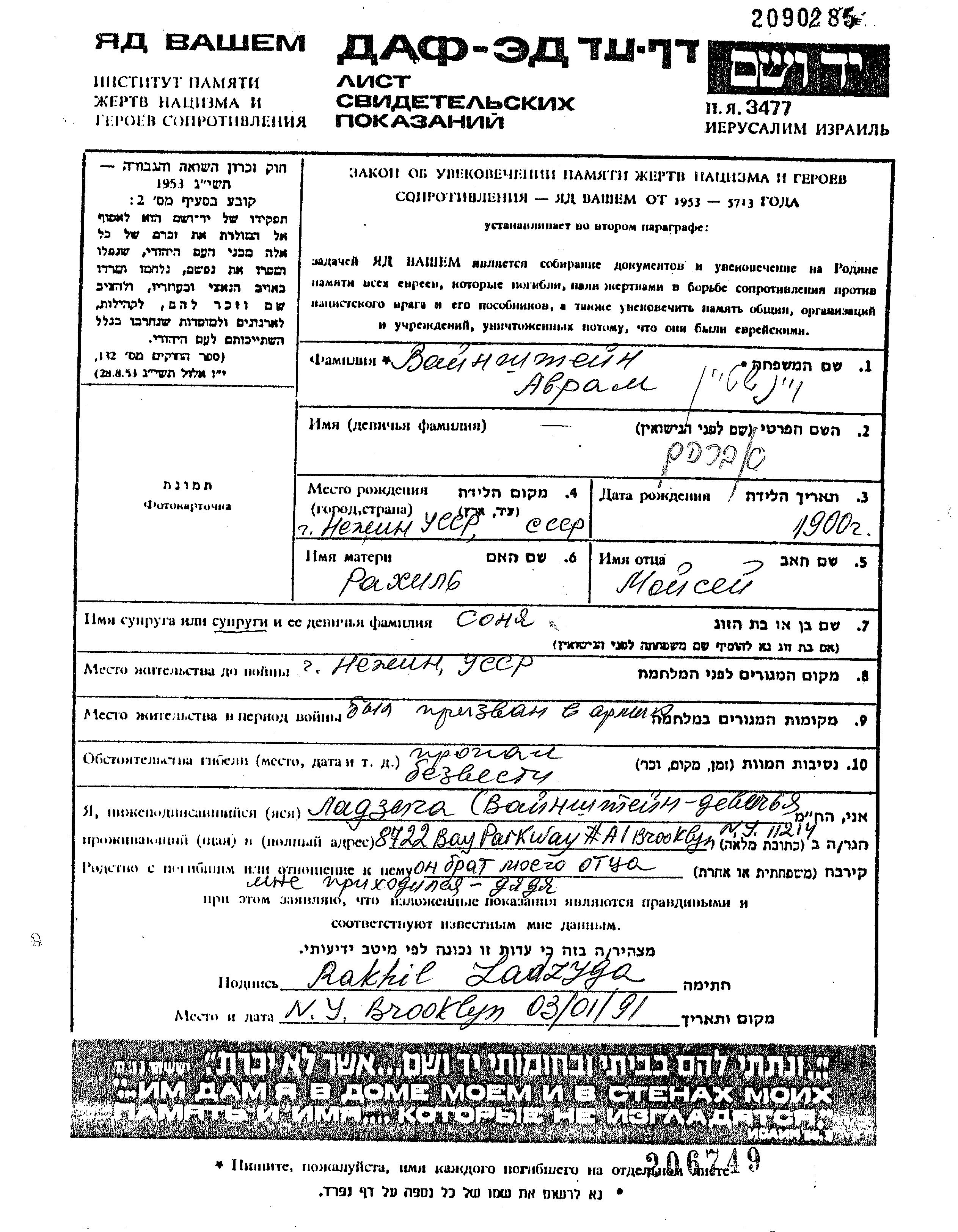 Avram Vainshtein wurde im Jahr 1900 in Nezhin, Ukraine (UdSSR) geboren. Er war der Sohn von Moisei und Rakhil. Er war mit Sonya Verheiratet. Vor dem Zweiten Weltkrieg lebte er in Nezhin, Ukraine (UdSSR). Während des Krieges war er in die Sowjetischen Streitkräfte.