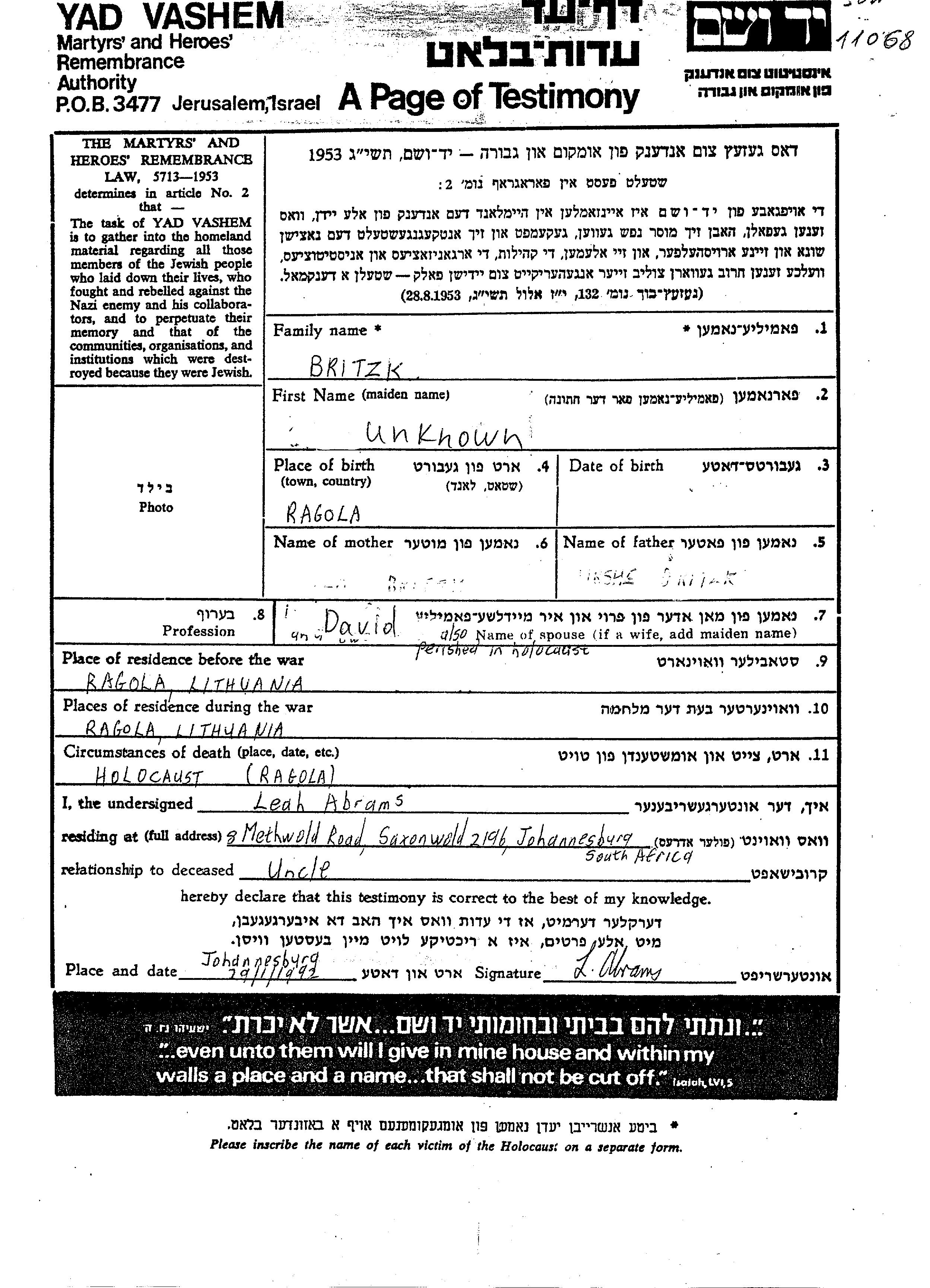 Vorname unbekannt Britzk. Sie war mit David Verheiratet.