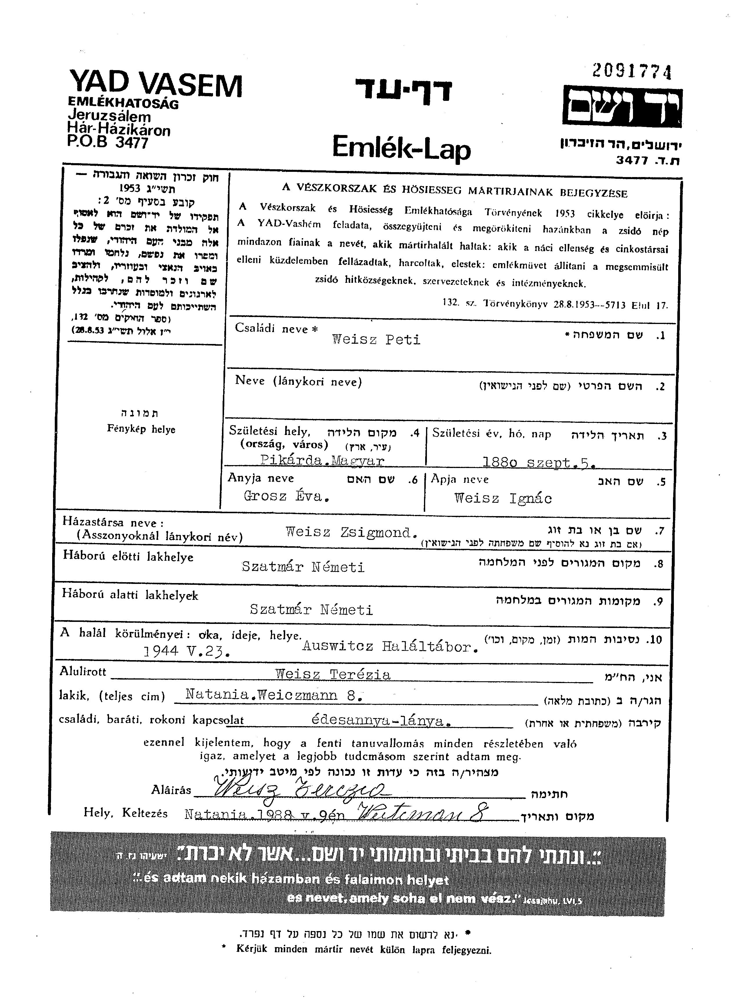 Peti Petti Patyi Weisz wurde im Jahr 1880 in Undeciphered Place, Ungarn geboren. Er war der Sohn von Ignac und Eva, geb. Grosz. Er war mit Zsigmond Verheiratet. Vor dem Zweiten Weltkrieg lebte er in Szatmarnemeti, Rumänien. Während des Krieges war er in Szatmarnemeti, Rumänien.