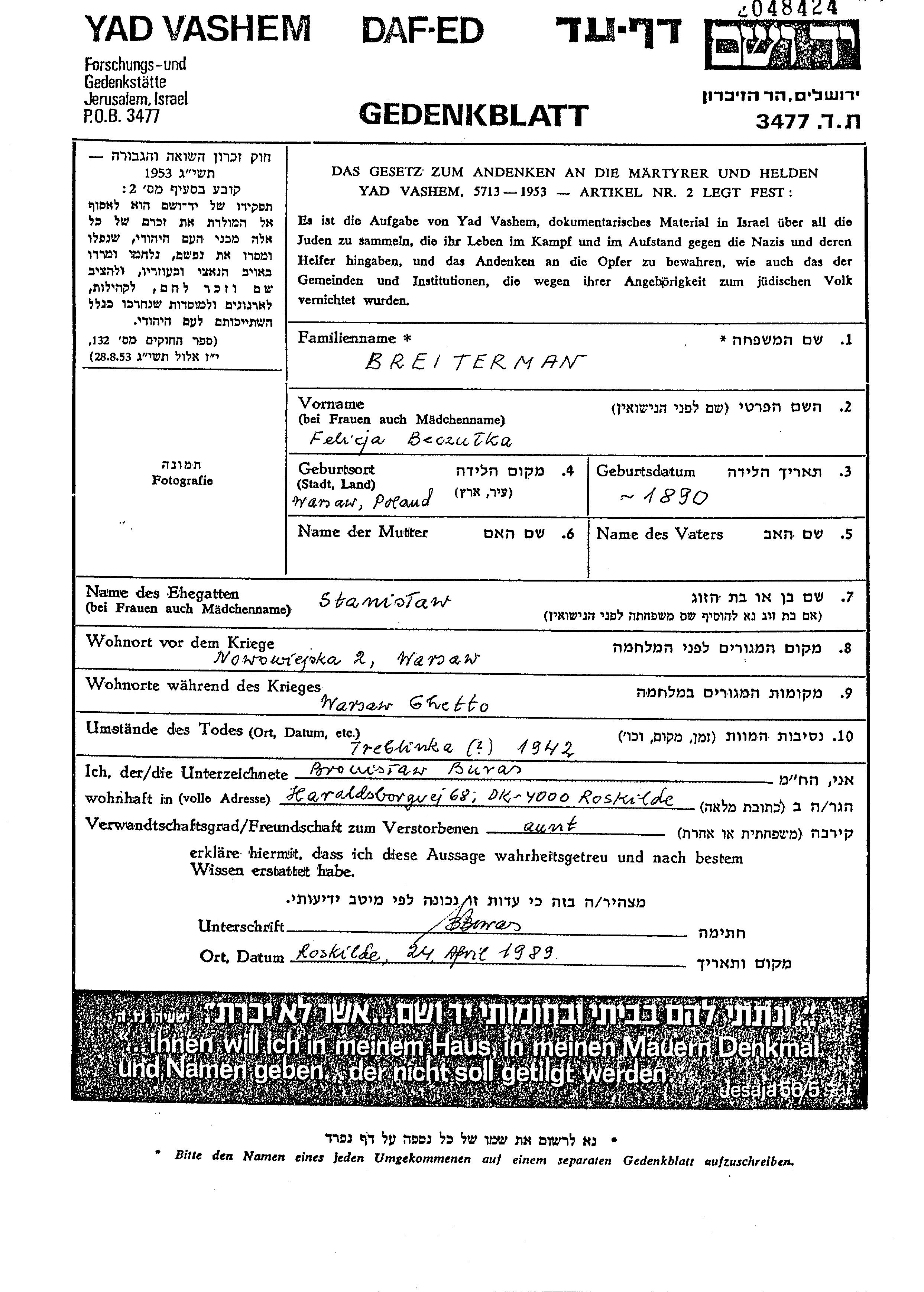 Breiterman Felicja 1890 Warszawa, Polen Gedenkblatt