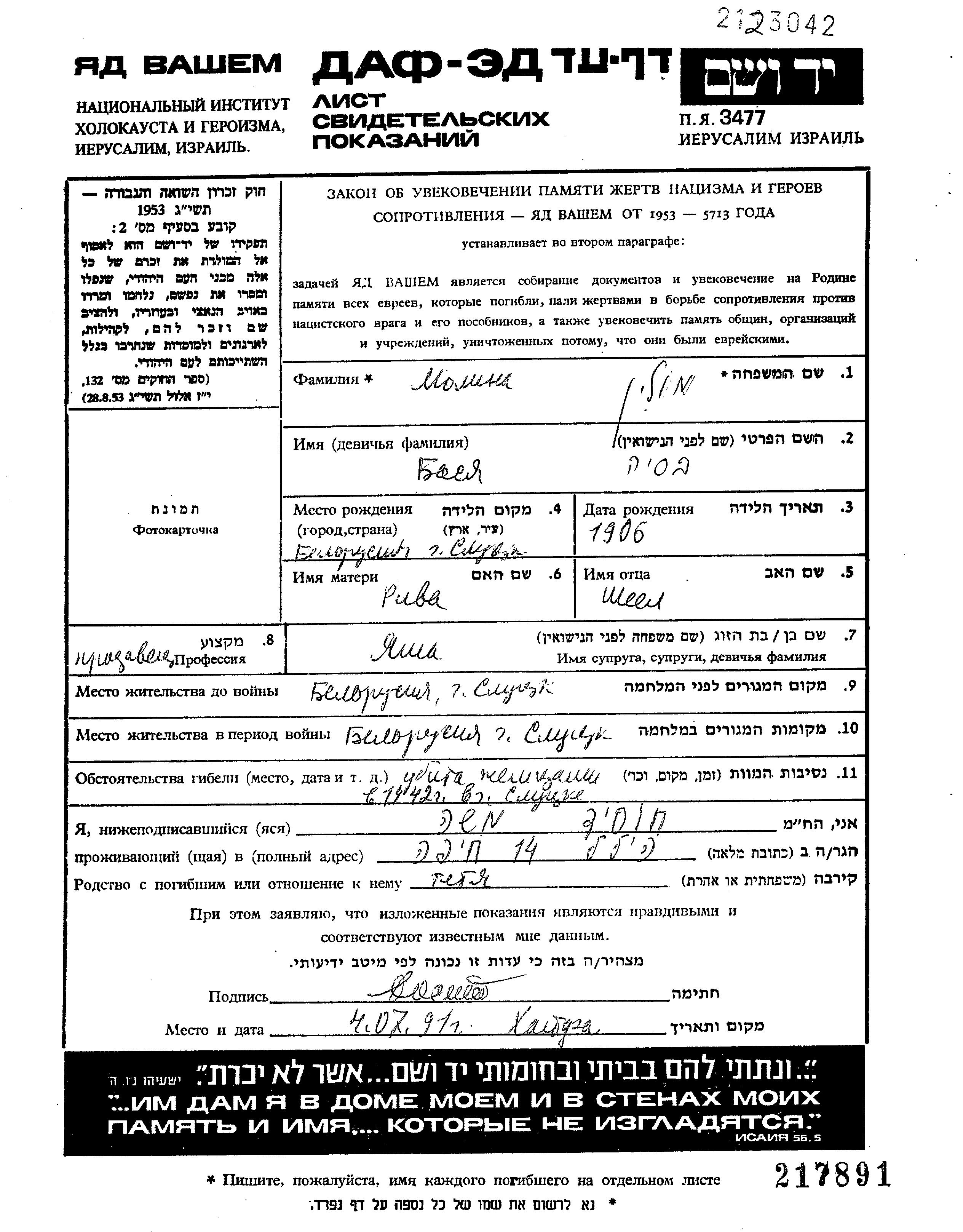Basya Molin wurde im Jahr 1906 in Slutsk, Weißrussland (UdSSR) geboren. Sie war die Tochter von Sheyel und Riva. Sie war Verkäufer/-in und mit Yasha Verheiratet. Vor dem Zweiten Weltkrieg lebte sie in Slutsk, Weißrussland (UdSSR). Während des Krieges war sie in Slutsk, Weißrussland (UdSSR).