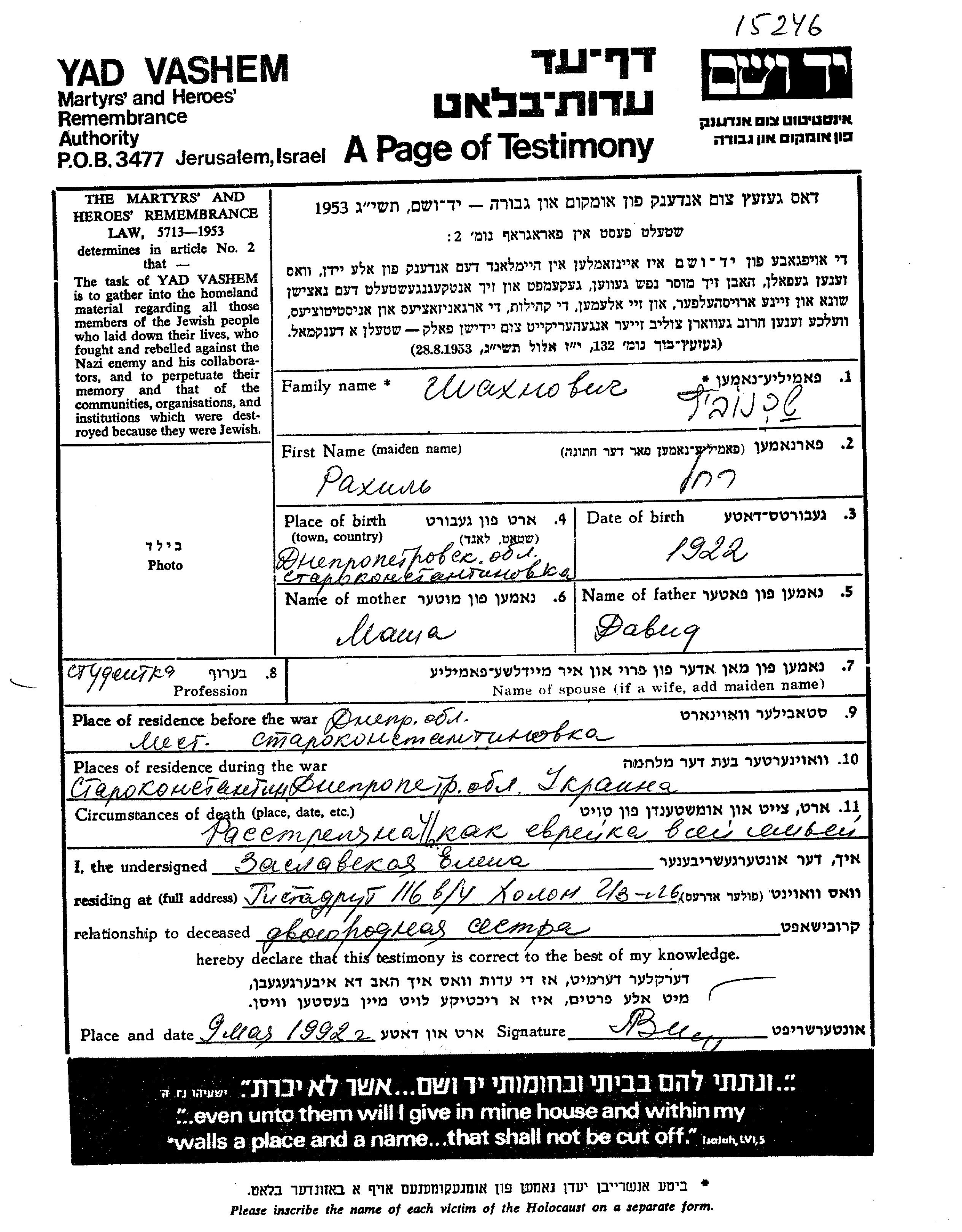 Shakhnovich Rakhil 1922 Starokonstantinov, Ukraine (UdSSR) Gedenkblatt