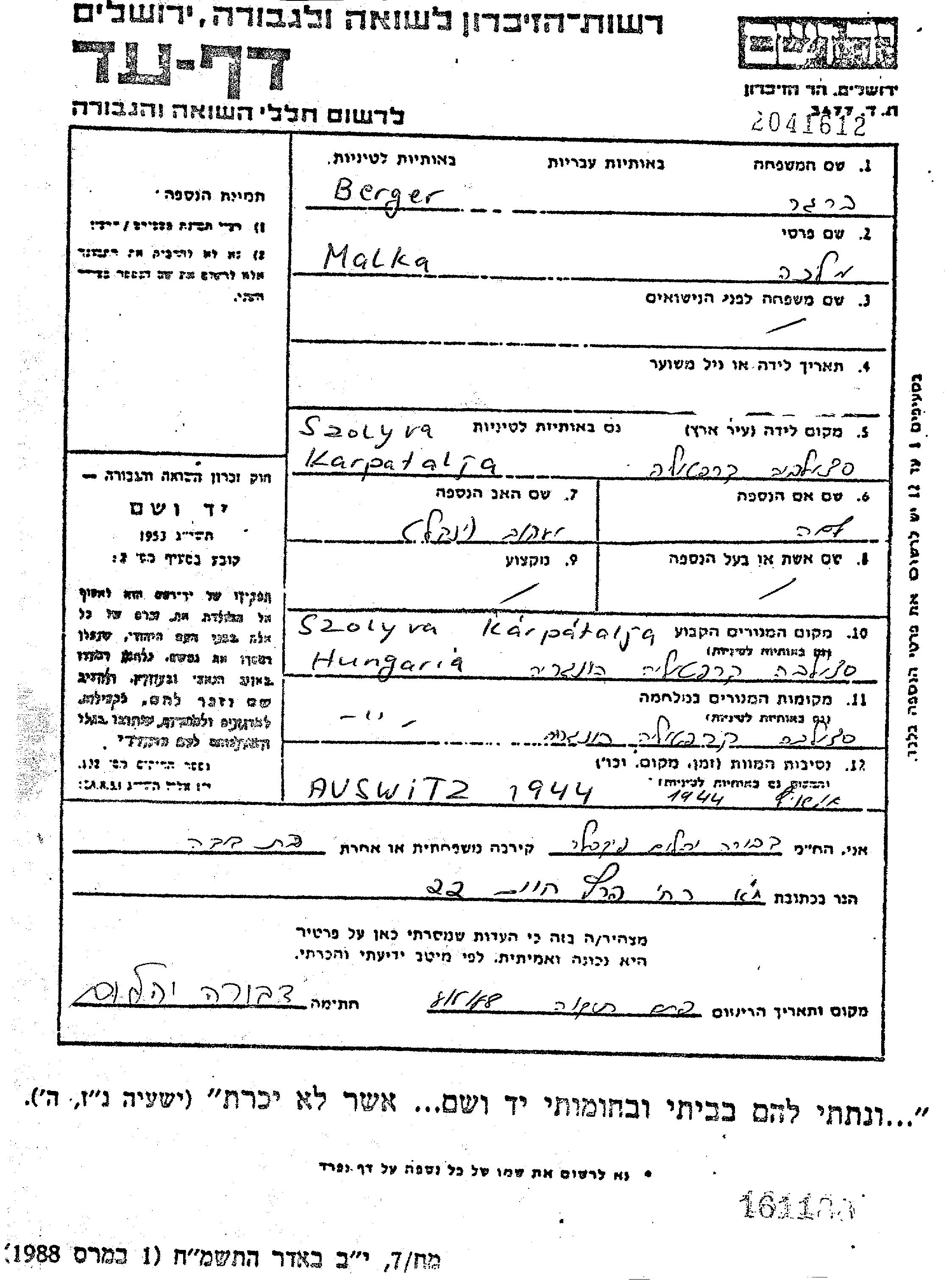 Malka Berger wurde in Szolyva, Tschechoslowakei geboren. Sie war die Tochter von Yakov und Lea. Vor dem Zweiten Weltkrieg lebte sie in Szolyva, Tschechoslowakei. Während des Krieges war sie in Szolyva, Tschechoslowakei.