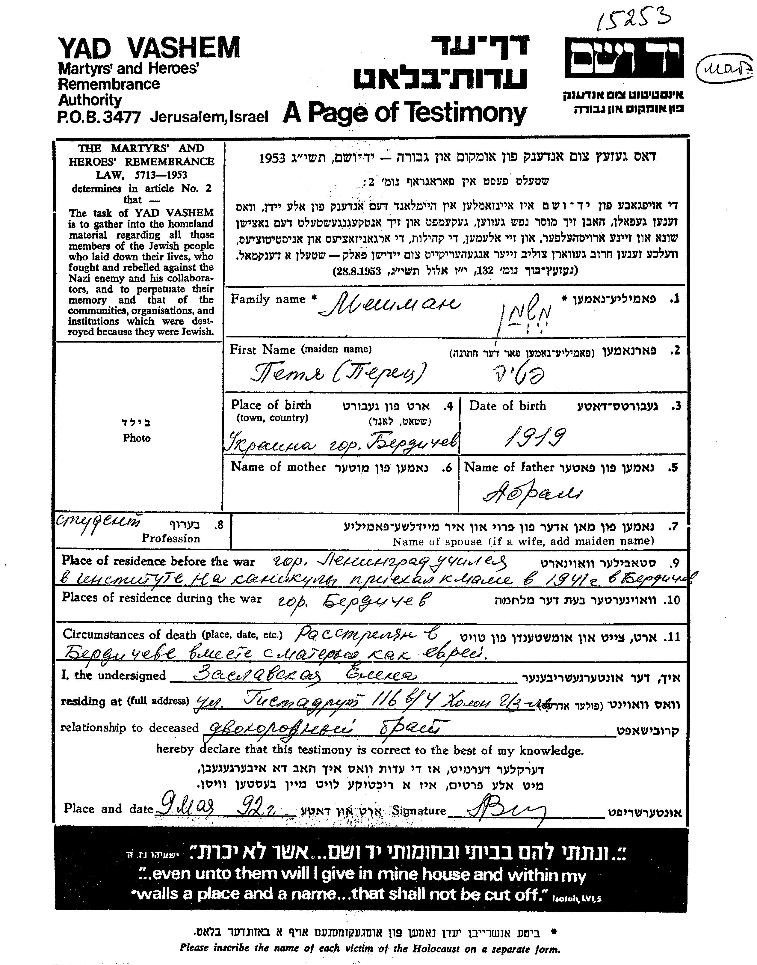 Petia Peretz Meshman wurde im Jahr 1919 in Berdichev, Ukraine (UdSSR) geboren. Er war der Sohn von Abram. Er war Student. Vor dem Zweiten Weltkrieg lebte er in Leningrad, Russland (UdSSR). Während des Krieges war er in Berdichev, Ukraine (UdSSR).