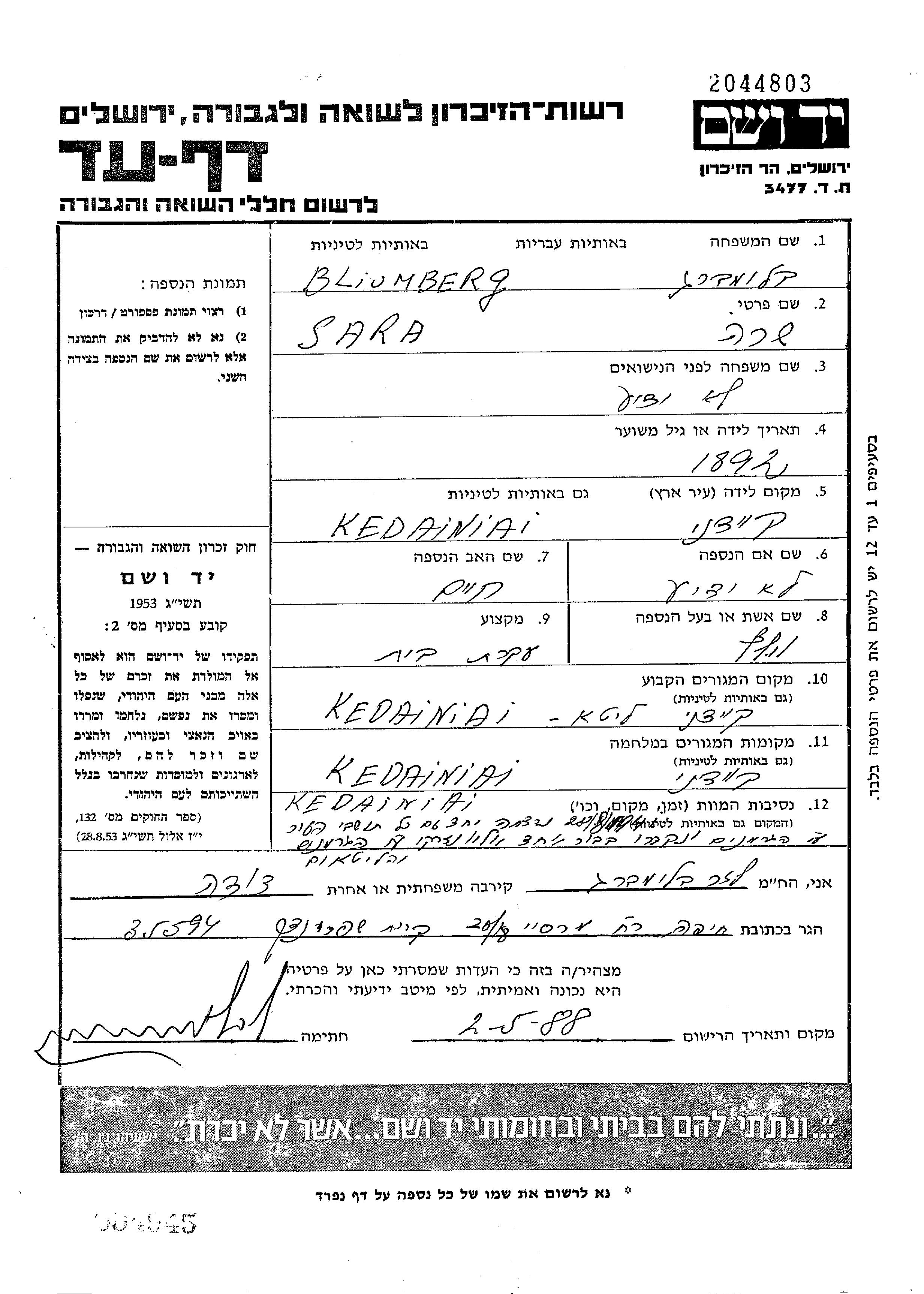 Sara Bliumberg wurde im Jahr 1892 in Kedainiai, Litauen geboren. Sie war die Tochter von Chaim. Sie war Hausfrau und mit Vulfe Zeev Verheiratet. Vor dem Zweiten Weltkrieg lebte sie in Kedainiai, Litauen. Während des Krieges war sie in Kedainiai, Litauen.