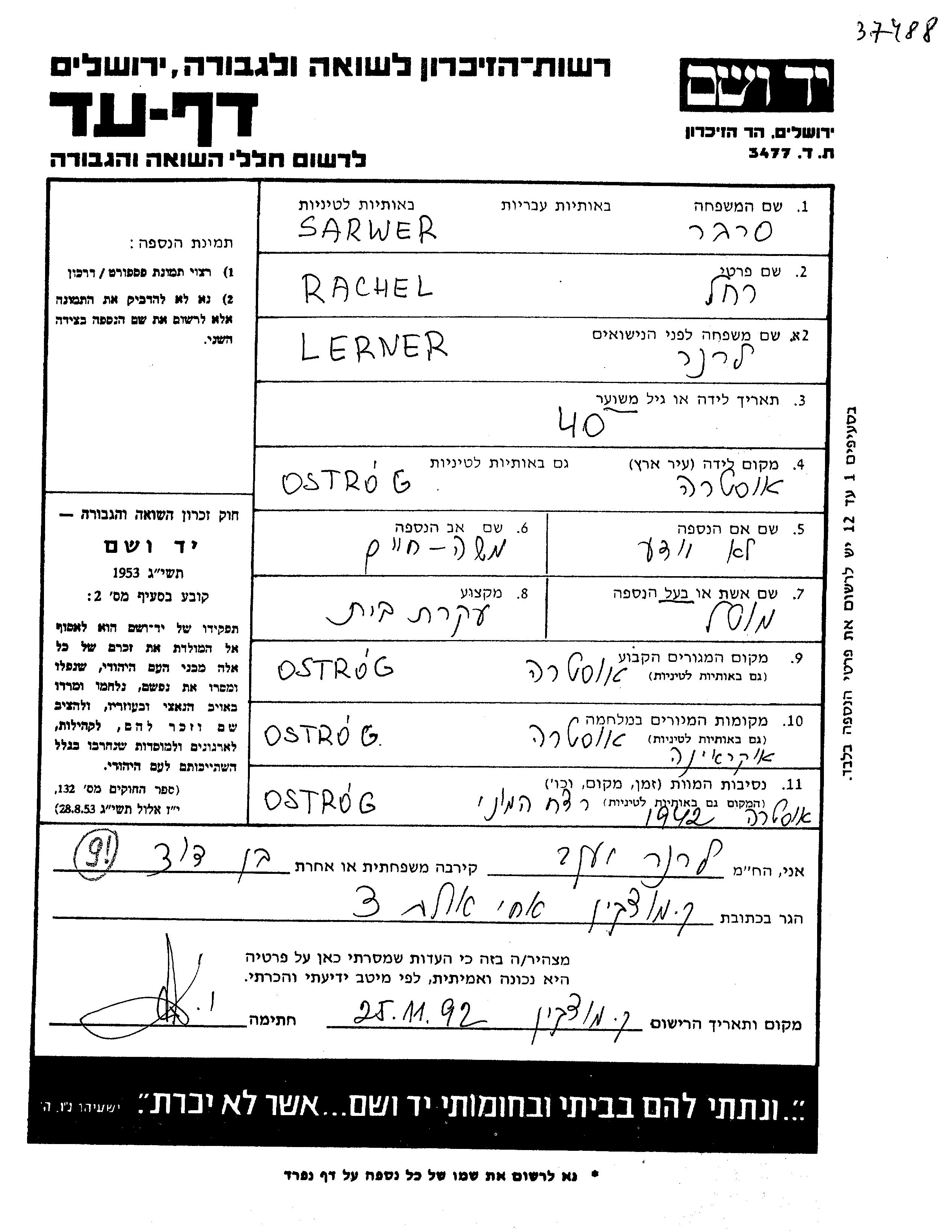 Rachel Sarwer, geb. Lerner wurde im Jahr 1902 in Ostrog, Polen geboren. Sie war die Tochter von Moshe Khaim. Sie war Hausfrau und mit Motel Verheiratet. Vor dem Zweiten Weltkrieg lebte sie in Ostrog, Polen. Während des Krieges war sie in Ostrog, Polen.