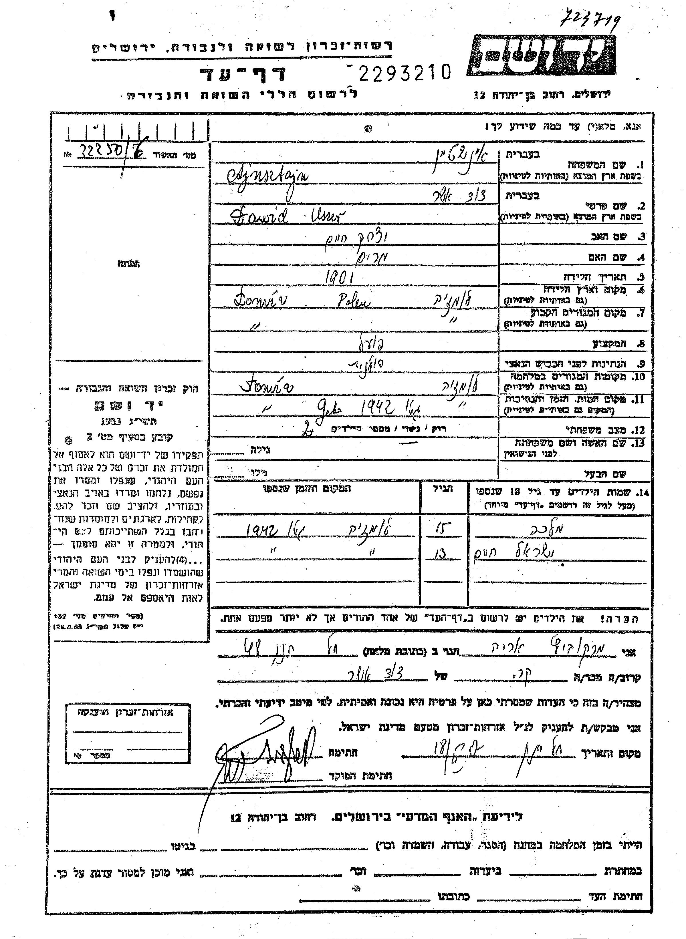 Ajnsztajn Dawid Asher 1901 Łomża, Polen Gedenkblatt
