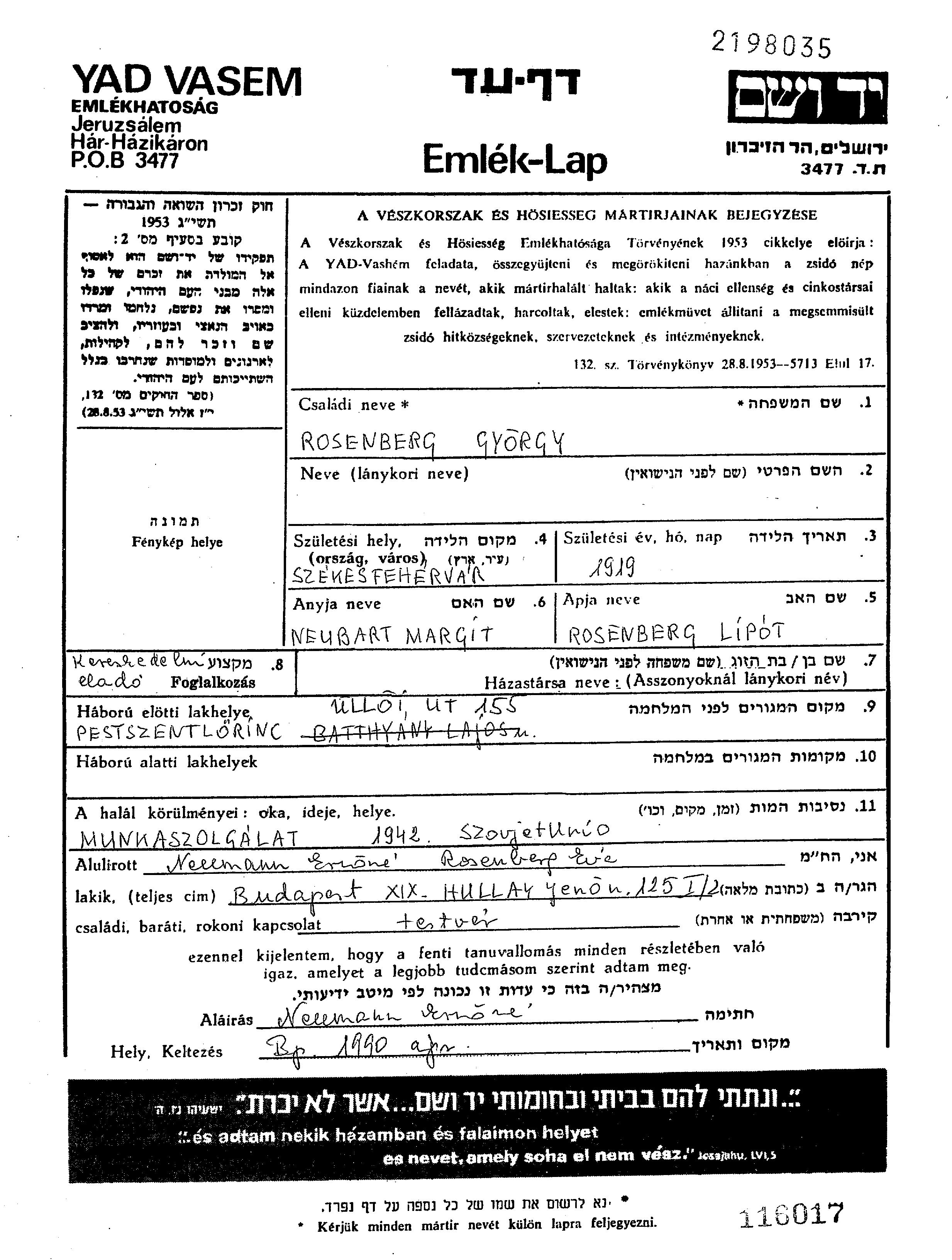 Rosenberg Gyorgy 1919 Pestszentlorinc, Ungarn Gedenkblatt