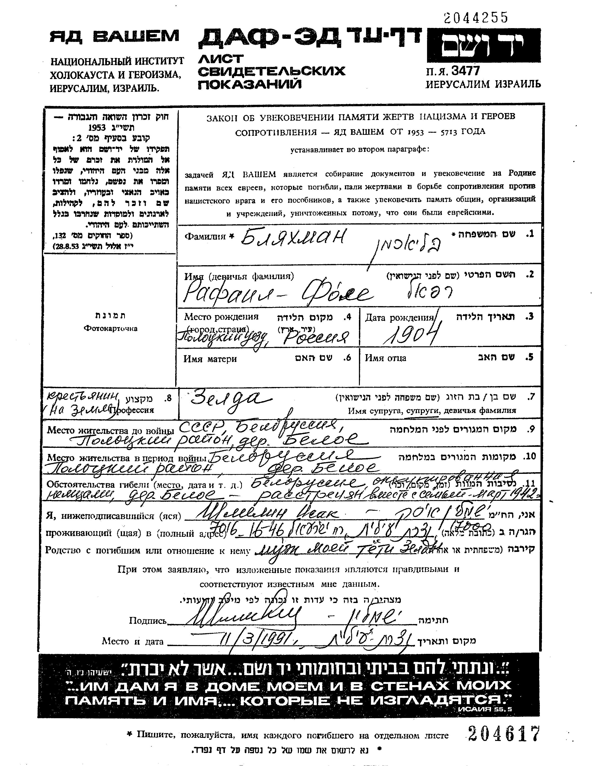 Rafael Blyakhman wurde im Jahr 1904 in Vitebsk, Weißrussland (UdSSR) geboren. Er war Landwirt und mit Zelda Verheiratet. Vor dem Zweiten Weltkrieg lebte er in Beloye, Weißrussland (UdSSR). Während des Krieges war er in Beloye, Weißrussland (UdSSR).