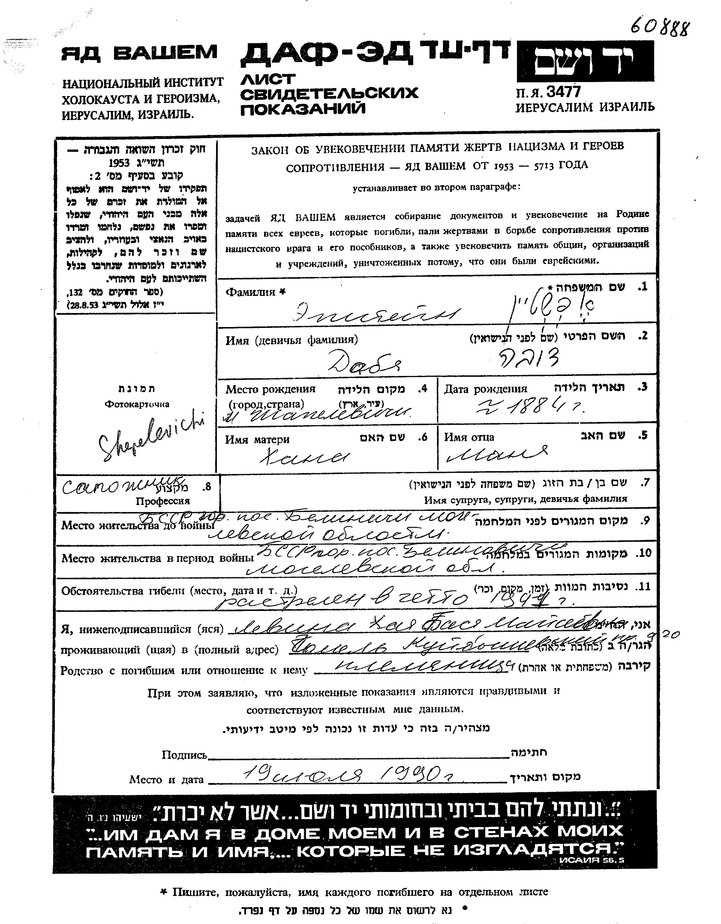 Doba Epshtein wurde im Jahr 1884 in Shepelevichi, Weißrussland (UdSSR) geboren. Sie war die Tochter von Mania und Khana. Sie war Schuster/-in. Vor dem Zweiten Weltkrieg lebte sie in Belynichi, Weißrussland (UdSSR). Während des Krieges war sie in Belynichi, Weißrussland (UdSSR).