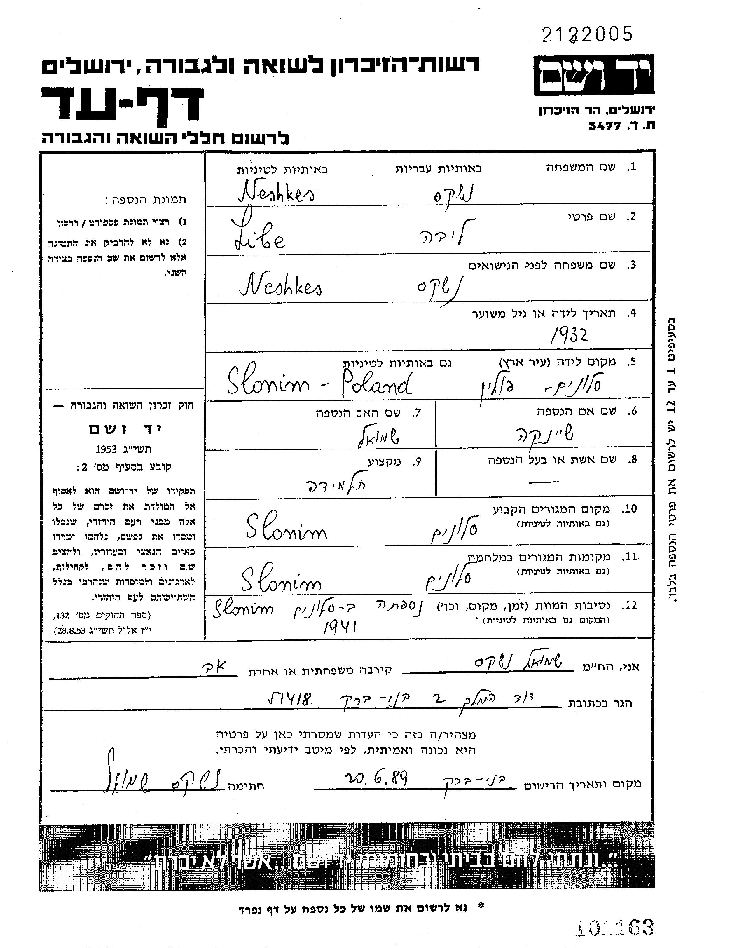 Liba Neshkes wurde im Jahr 1932 in Slonim, Polen geboren. Sie war die Tochter von Shmuel und Sheinka, geb. Abramovicz. Sie war Schüler/-in und Kind. Vor dem Zweiten Weltkrieg lebte sie in Slonim, Polen. Während des Krieges war sie in Slonim, Polen.