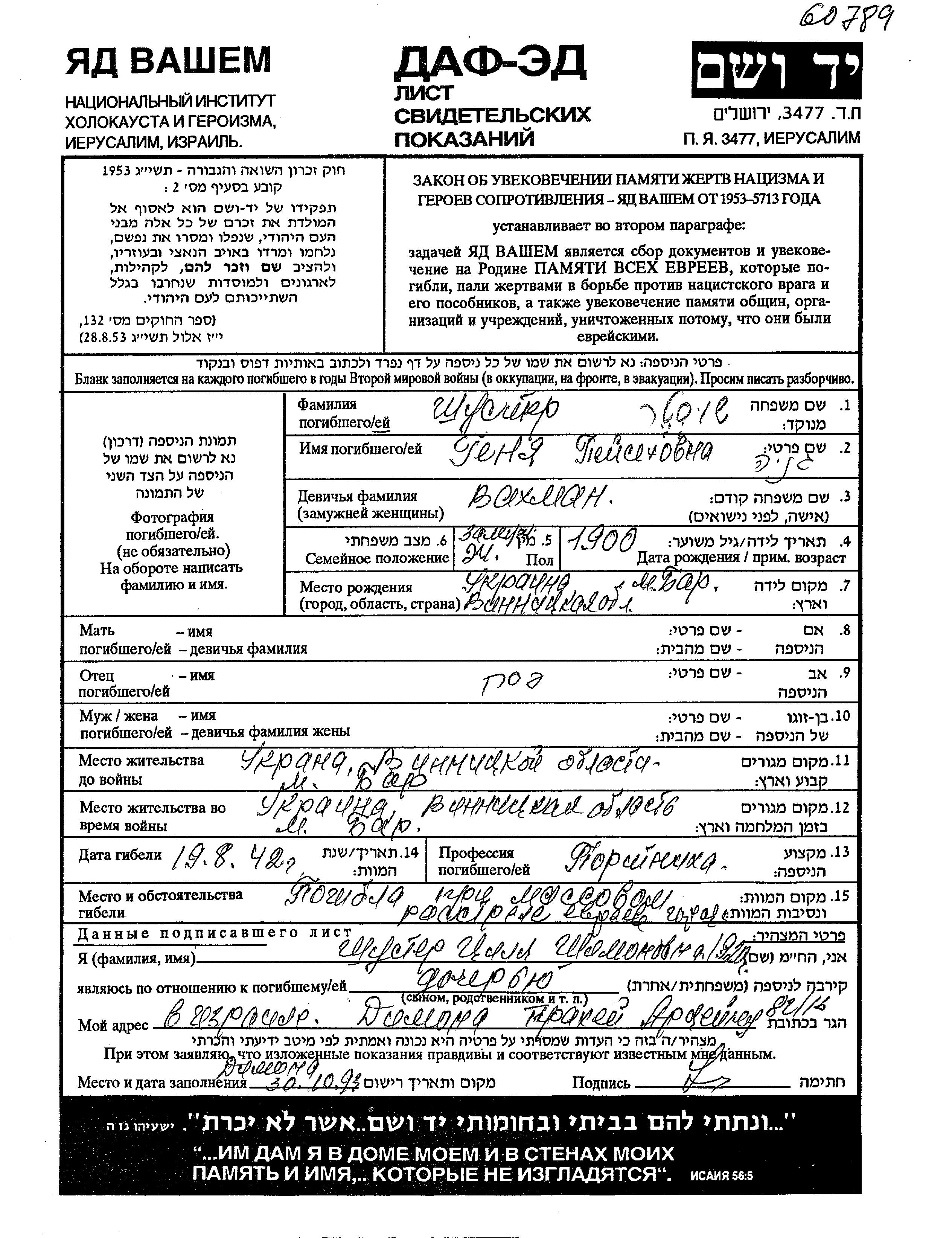 Genia Shuster, geb. Vakhman wurde im Jahr 1900 in Bar, Ukraine (UdSSR) geboren. Sie war die Tochter von Pesakh. Sie war Schneider und Verheiratet. Vor dem Zweiten Weltkrieg lebte sie in Bar, Ukraine (UdSSR). Während des Krieges war sie in Bar, Ukraine (UdSSR).