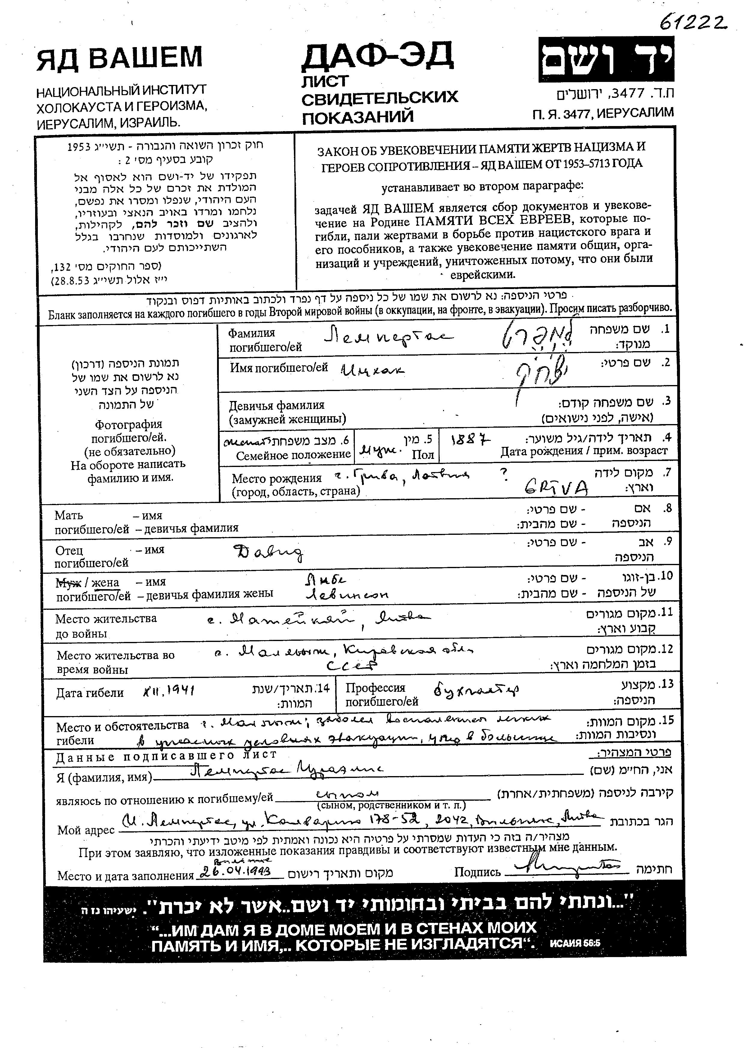 Yitzkhak Lempertas wurde im Jahr 1887 in Griva, Lettland geboren. Er war der Sohn von David. Er war Buchhalter/-in und mit Liba Verheiratet. Vor dem Zweiten Weltkrieg lebte er in Mazeikiai, Litauen. Während des Krieges war er in Kirov, Sowjetunion.