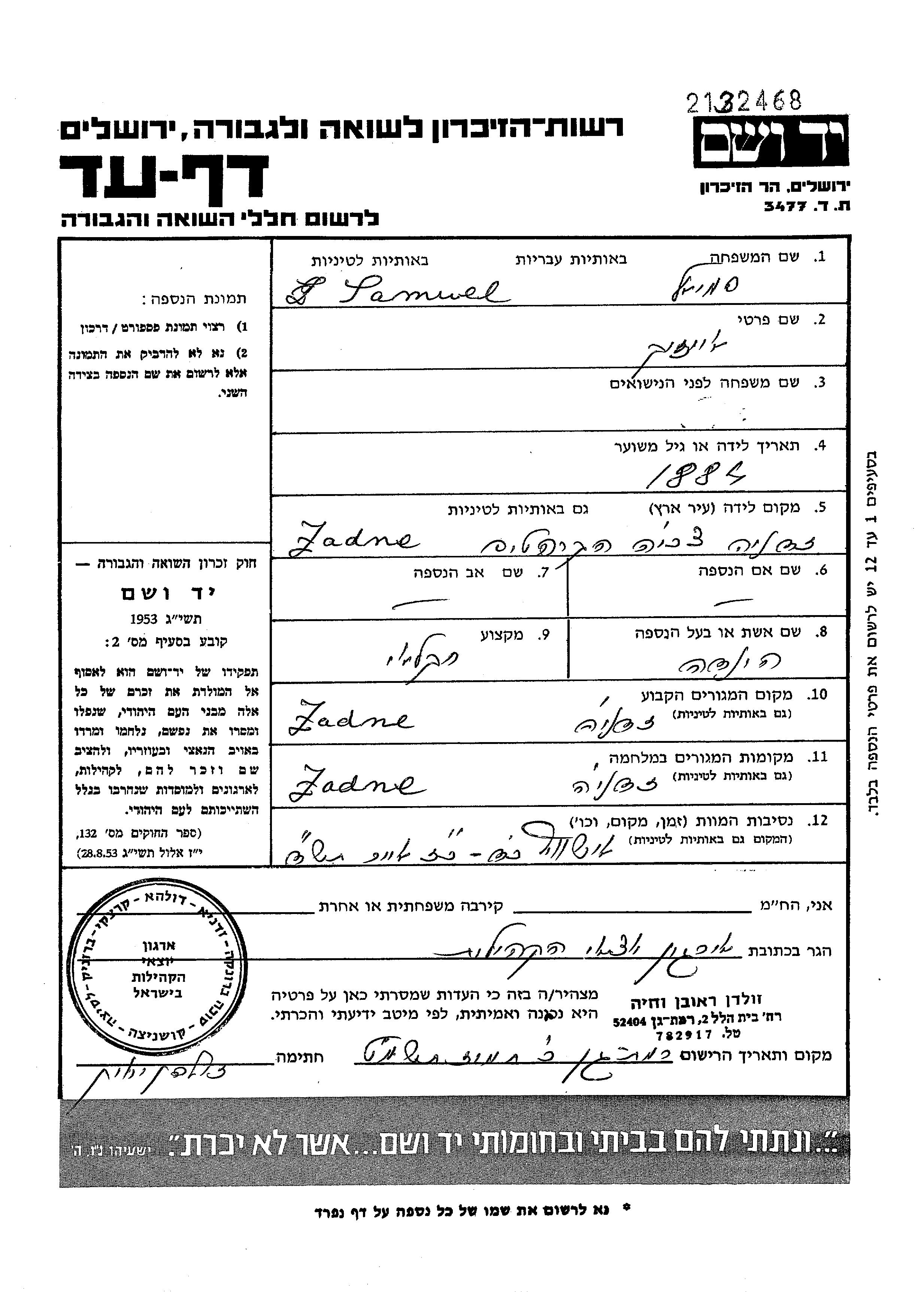 Aizik Samuel wurde im Jahr 1884 in Zadne, Tschechoslowakei geboren. Er war Landwirt und mit Hinda Verheiratet. Vor dem Zweiten Weltkrieg lebte er in Zadne, Tschechoslowakei. Während des Krieges war er in Zadne, Tschechoslowakei.