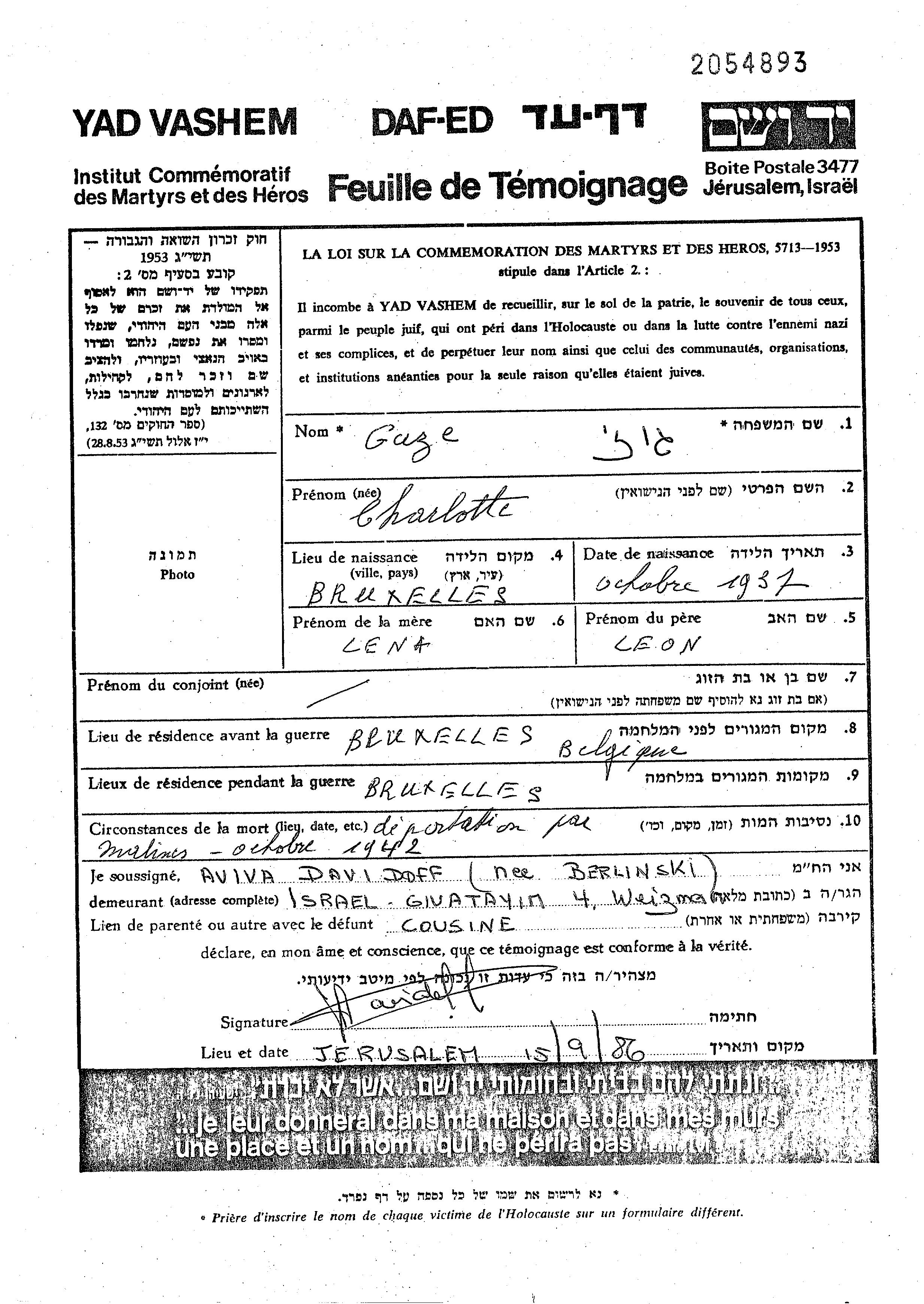 Charlott Guze wurde im Jahr 1937 in Bruxelles, Belgien geboren. Sie war die Tochter von Leon und Lena, geb. Berlinski. Sie war Kind. Vor dem Zweiten Weltkrieg lebte sie in Bruxelles, Belgien. Während des Krieges war sie in Bruxelles, Belgien.