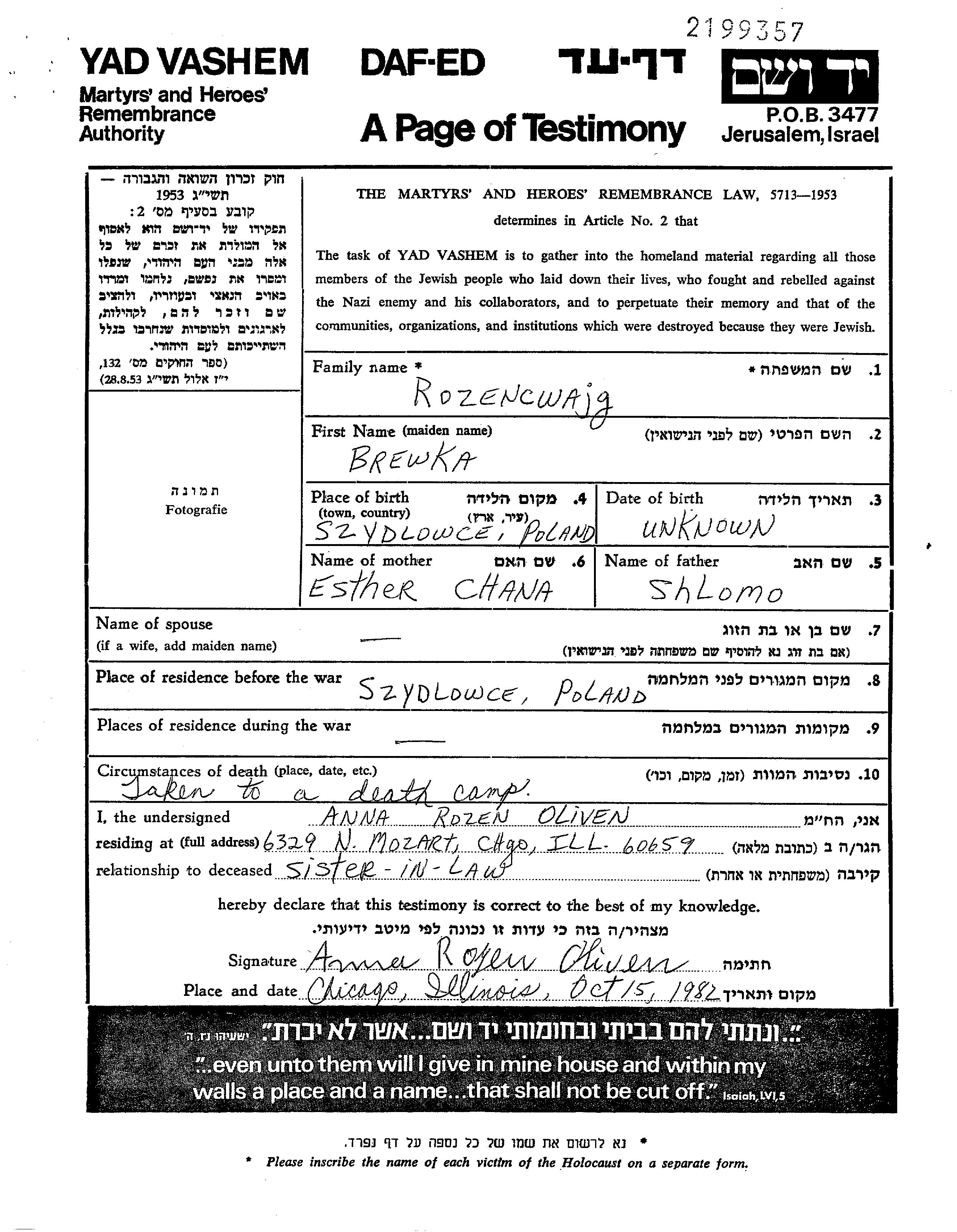 Brewka Rozencwajg wurde in Szydlowiec, Polen geboren. Sie war die Tochter von Shlomo und Esther Chana. Vor dem Zweiten Weltkrieg lebte sie in Szydlowiec, Polen.