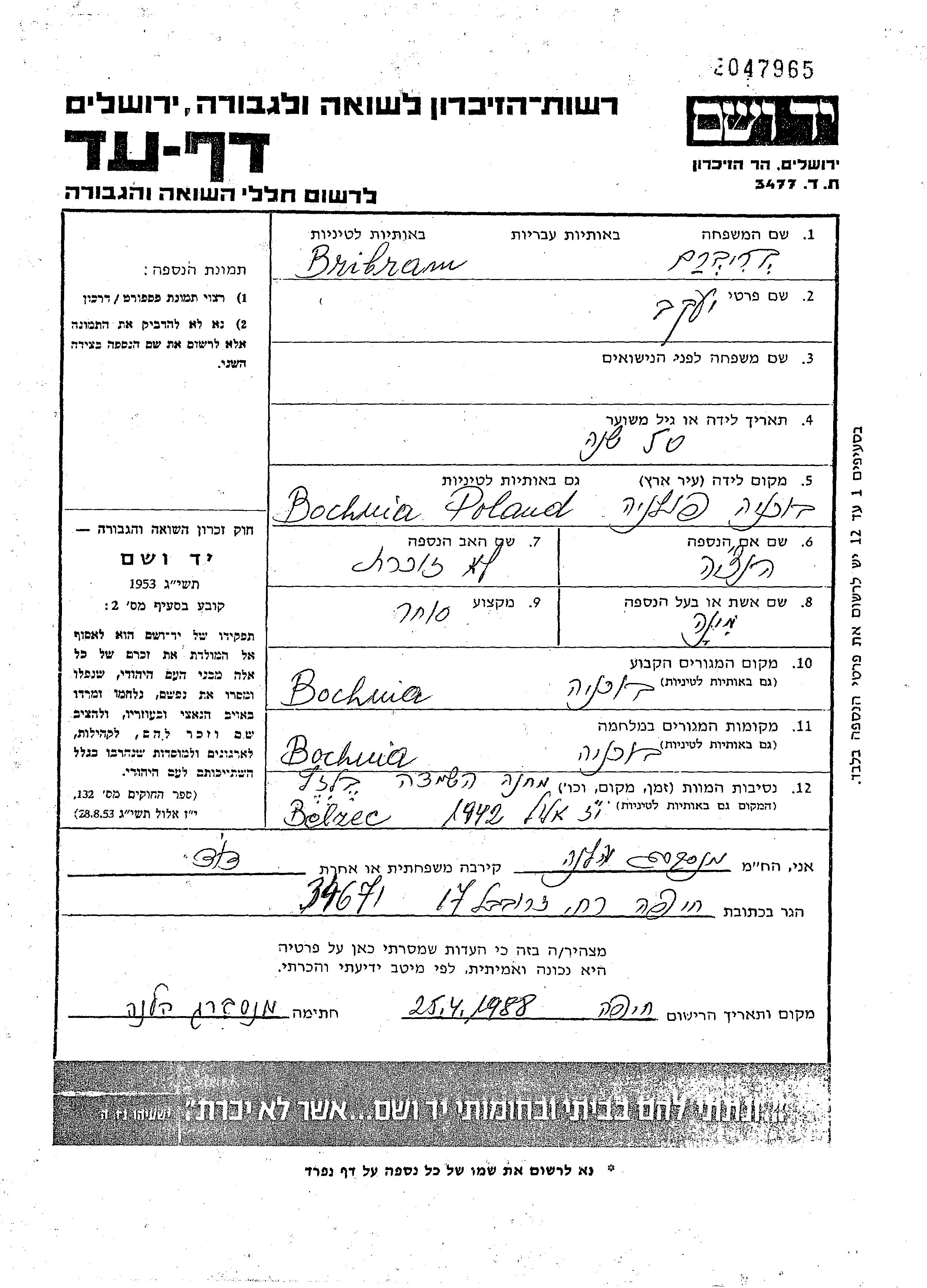 Bribram Yakov Bochnia, Polen Gedenkblatt