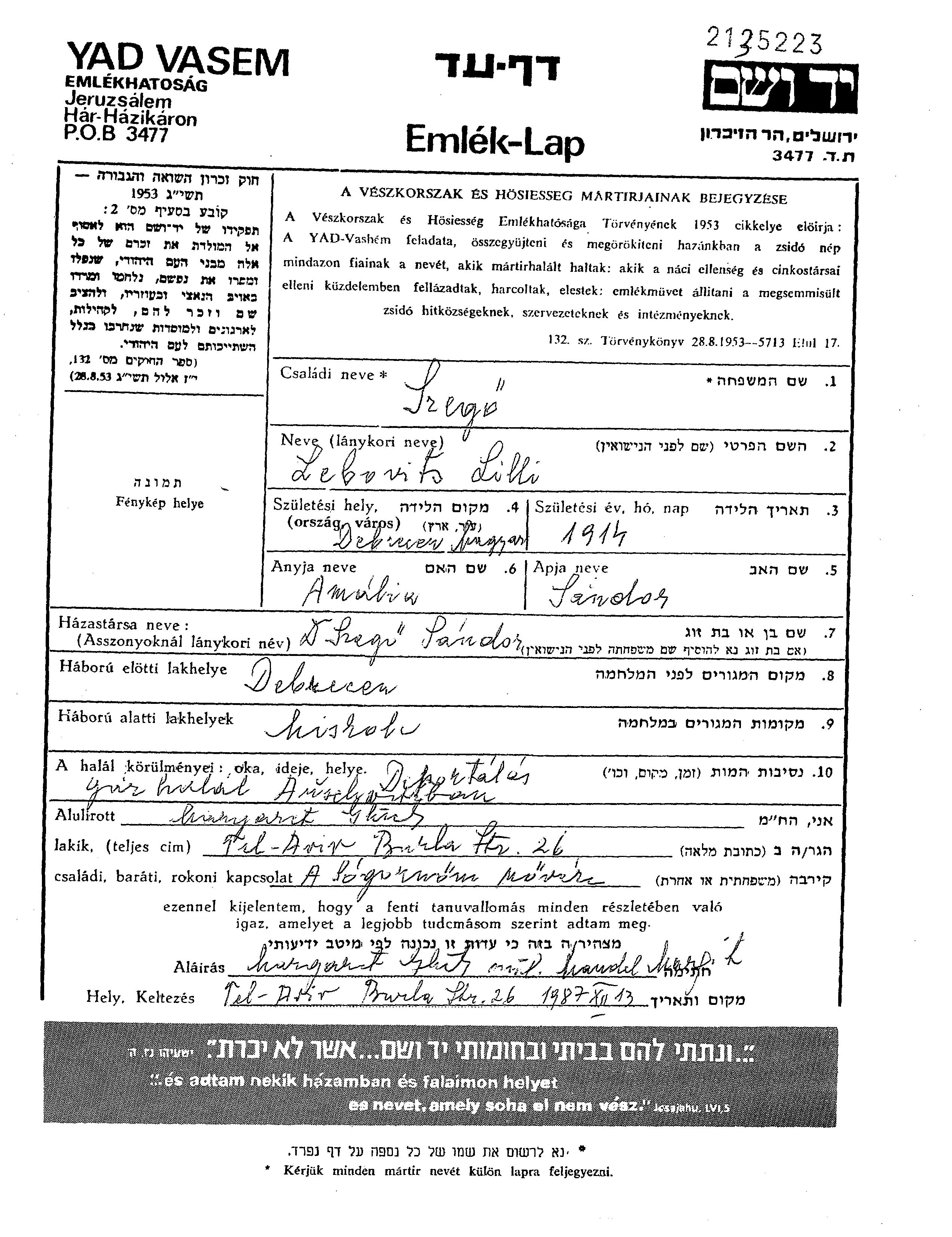 Lilli Szego, geb. Lebovits wurde in Debrecen, Ungarn geboren. Sie war die Tochter von Sandor und Amalia. Sie war mit Sandor Verheiratet. Vor dem Zweiten Weltkrieg lebte sie in Debrecen, Ungarn. Während des Krieges war sie in Miskolc, Ungarn.