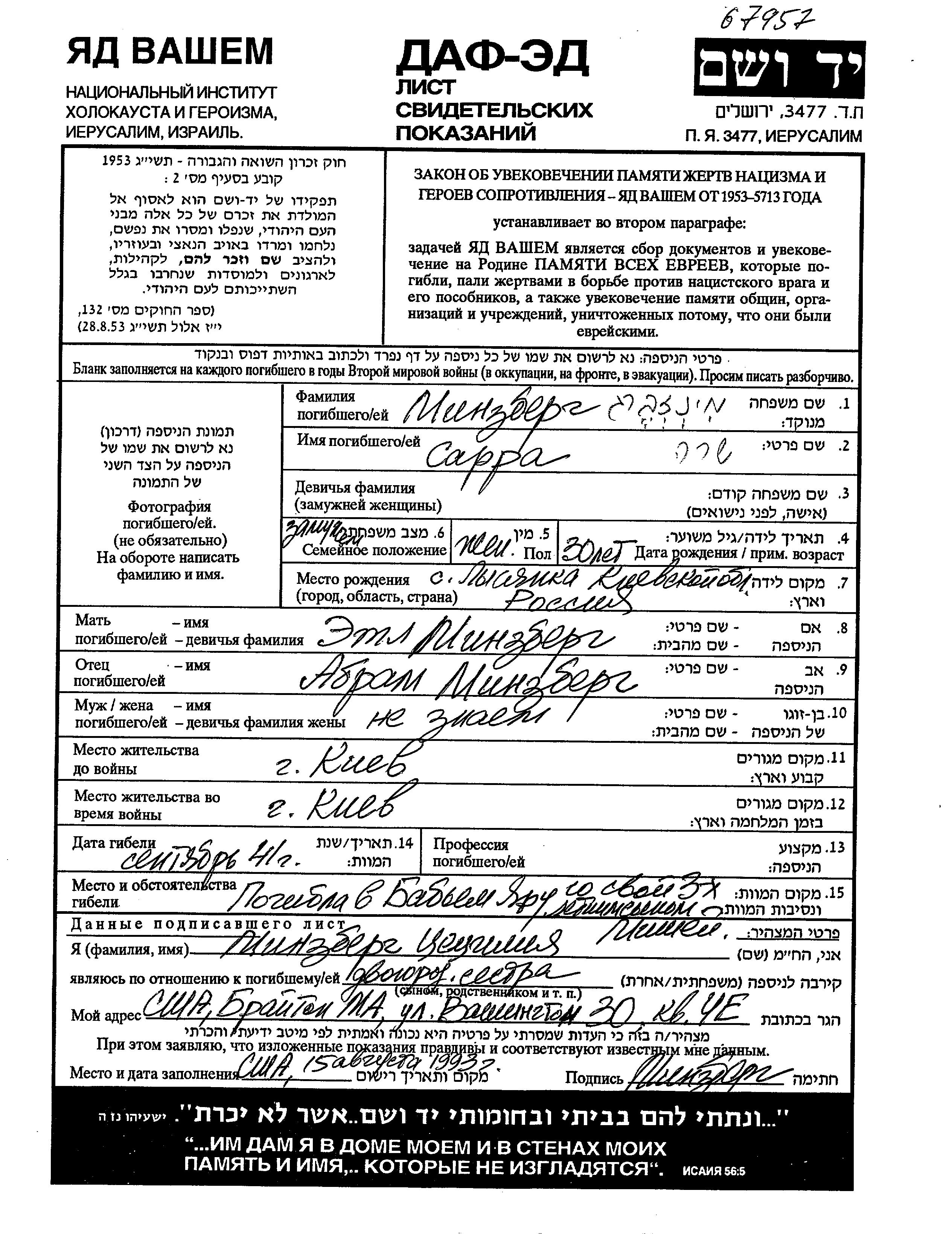 Minzberg Sara 1911 Kiyev, Ukraine (UdSSR) Gedenkblatt