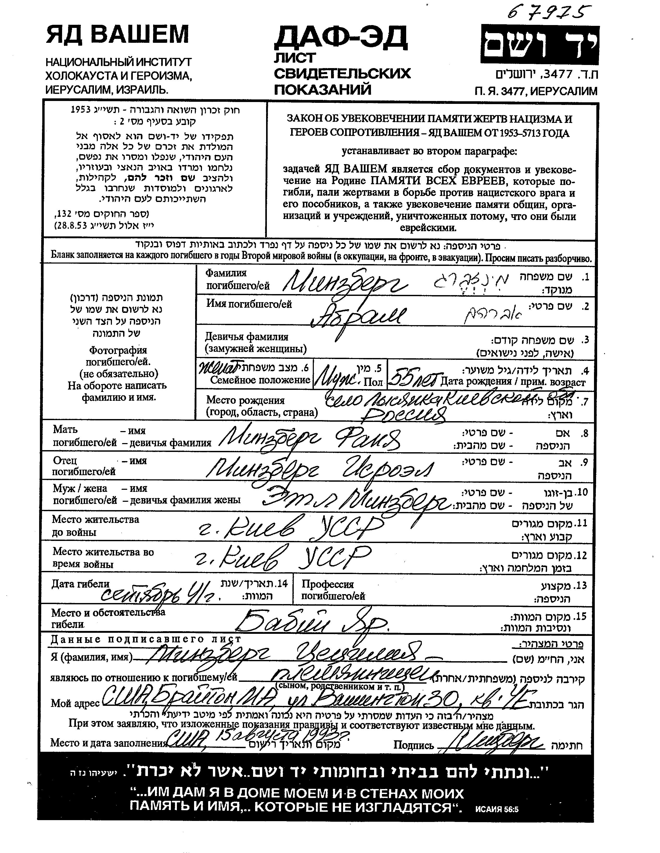 Abram Minzberg wurde im Jahr 1886 in Lysyanka, Ukraine (UdSSR) geboren. Er war der Sohn von Isroel und Fania. Er war mit Etl Verheiratet. Vor dem Zweiten Weltkrieg lebte er in Kiyev, Ukraine (UdSSR). Während des Krieges war er in Kiyev, Ukraine (UdSSR).
