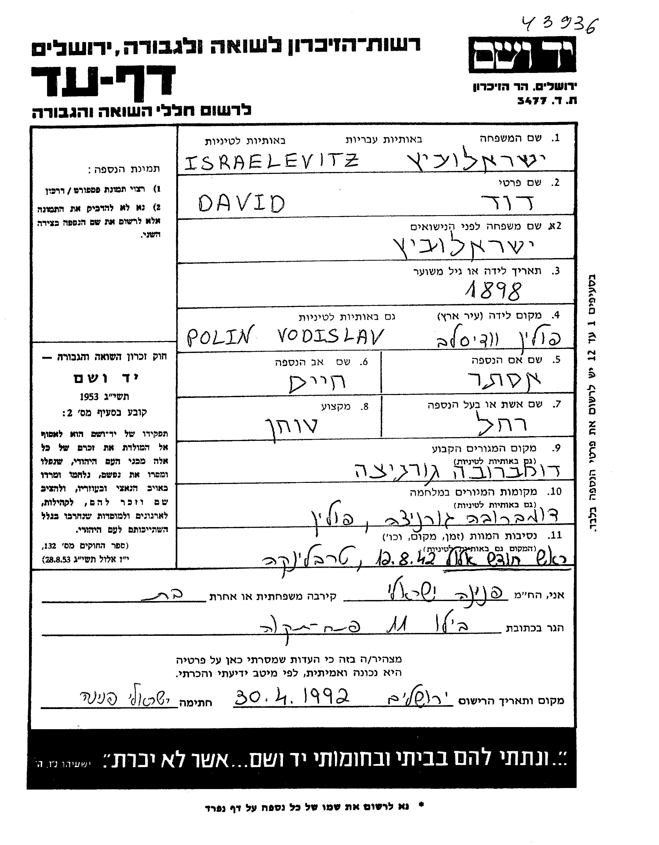 David wurde in der Schoah ermordet. Todesort: Treblinka, Polen im Jahr 12/08/1942.