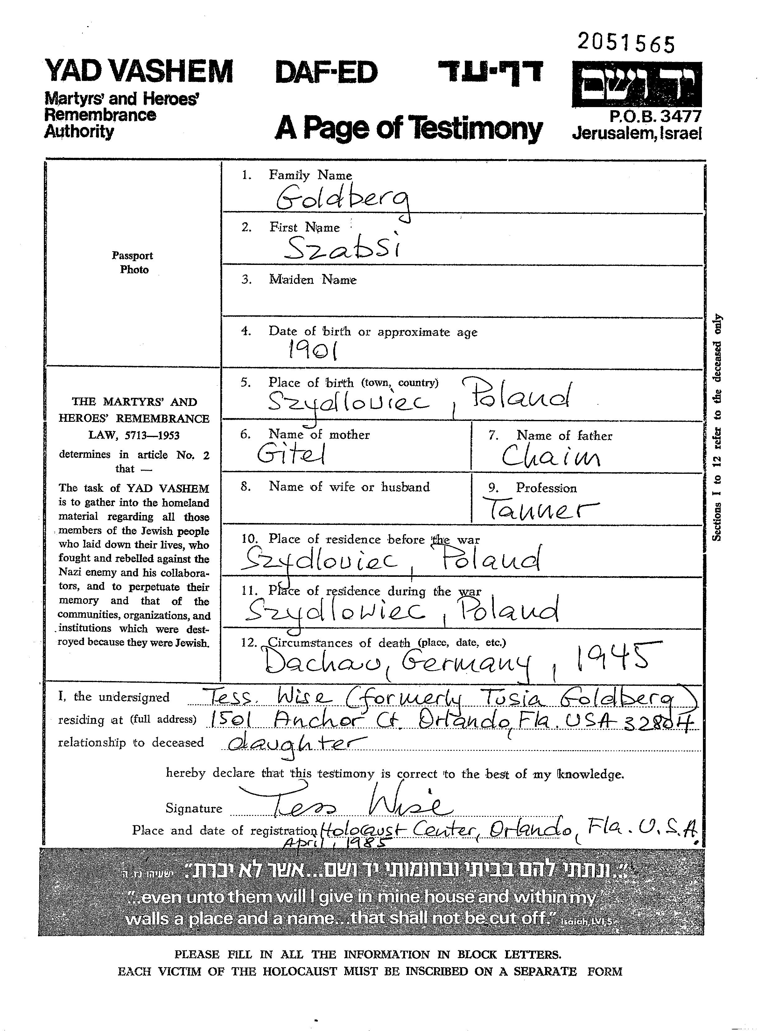 Szabsi Goldberg wurde im Jahr 1901 in Szydlowiec, Polen geboren. Er war der Sohn von Chaim und Gitel. Er war Gerber. Vor dem Zweiten Weltkrieg lebte er in Szydlowiec, Polen. Während des Krieges war er in Szydlowiec, Polen.