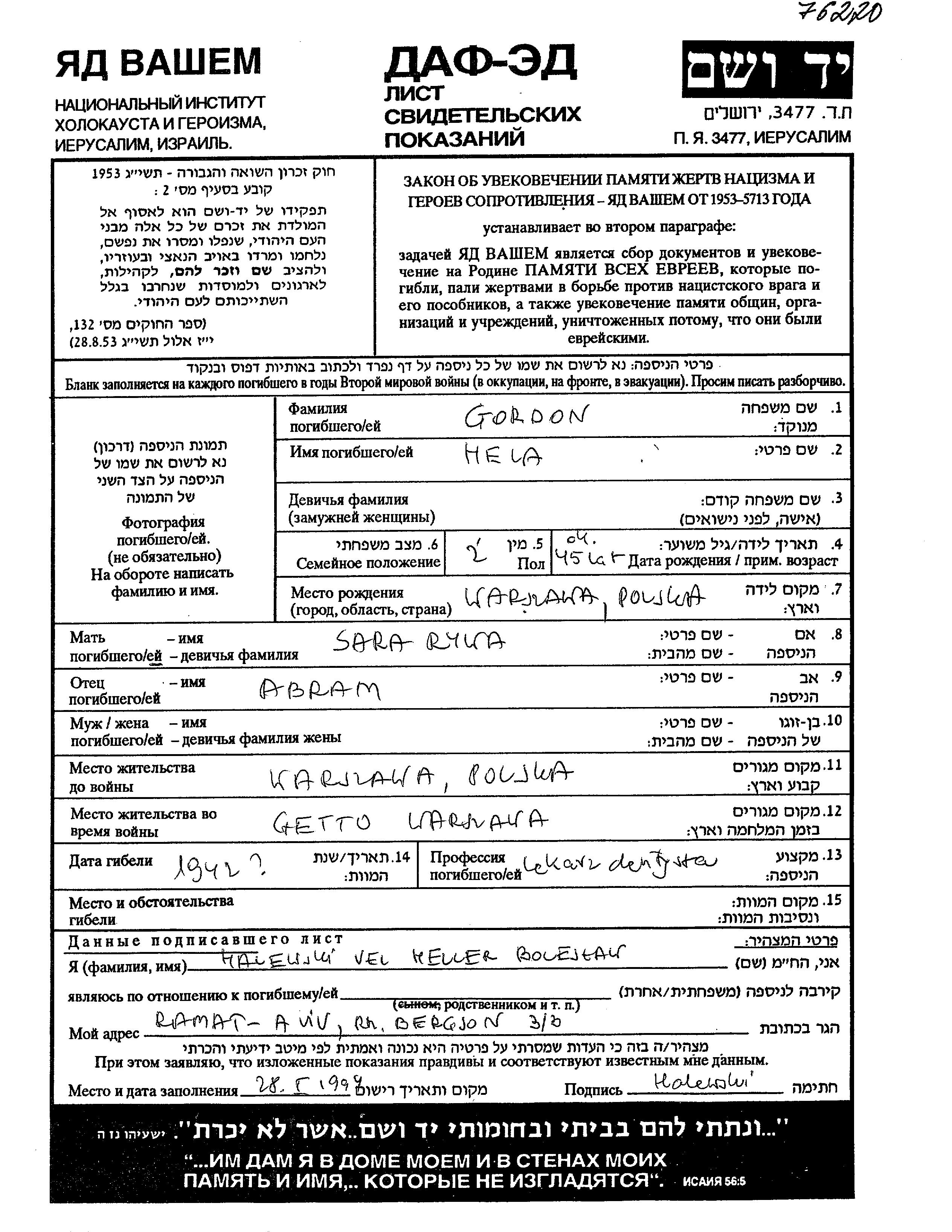 Hela Gordon wurde im Jahr 1897 in Warszawa, Polen geboren. Sie war die Tochter von Abram und Rywa Sara. Sie war Zahnarzt/-ärztin. Vor dem Zweiten Weltkrieg lebte sie in Warszawa, Polen. Während des Krieges war sie in Warszawa, Polen.
