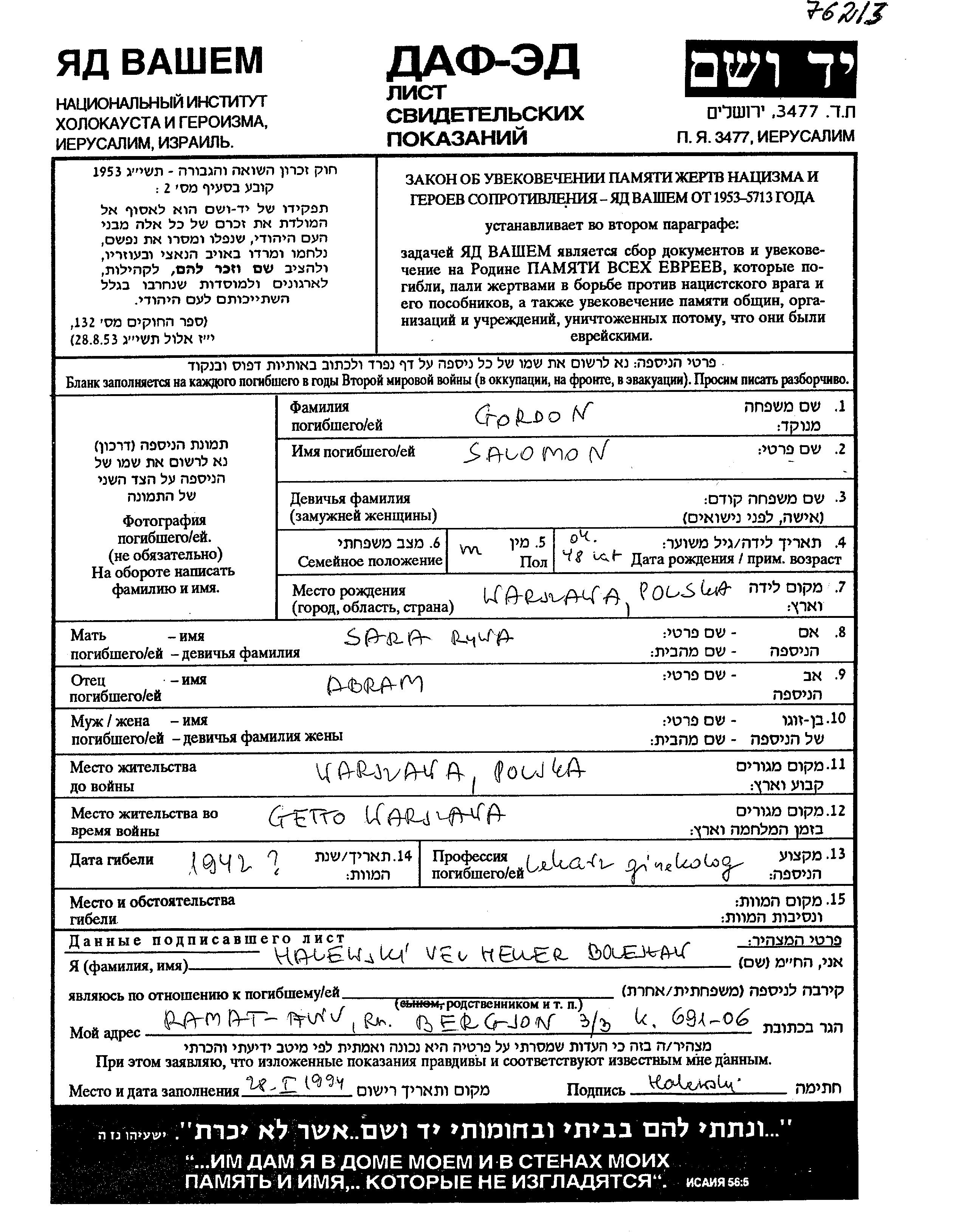 Salomon Gordon wurde im Jahr 1894 in Warszawa, Polen geboren. Er war der Sohn von Abram und Rywa Sara. Er war Frauenarzt. Vor dem Zweiten Weltkrieg lebte er in Warszawa, Polen. Während des Krieges war er in Warszawa, Polen.