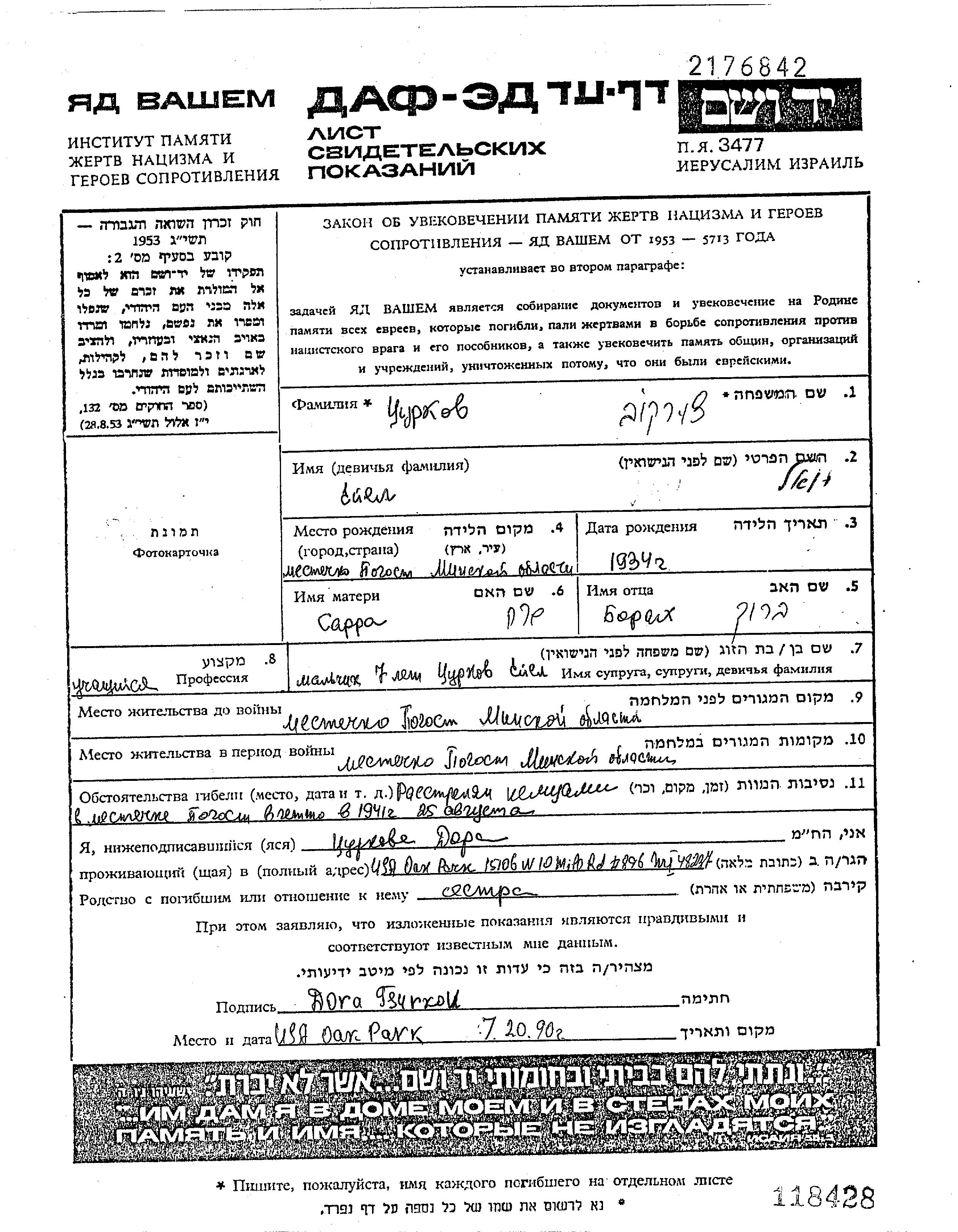 Churkov Eiyel Yoel 1934 Pogost, Weißrussland (UdSSR) Gedenkblatt