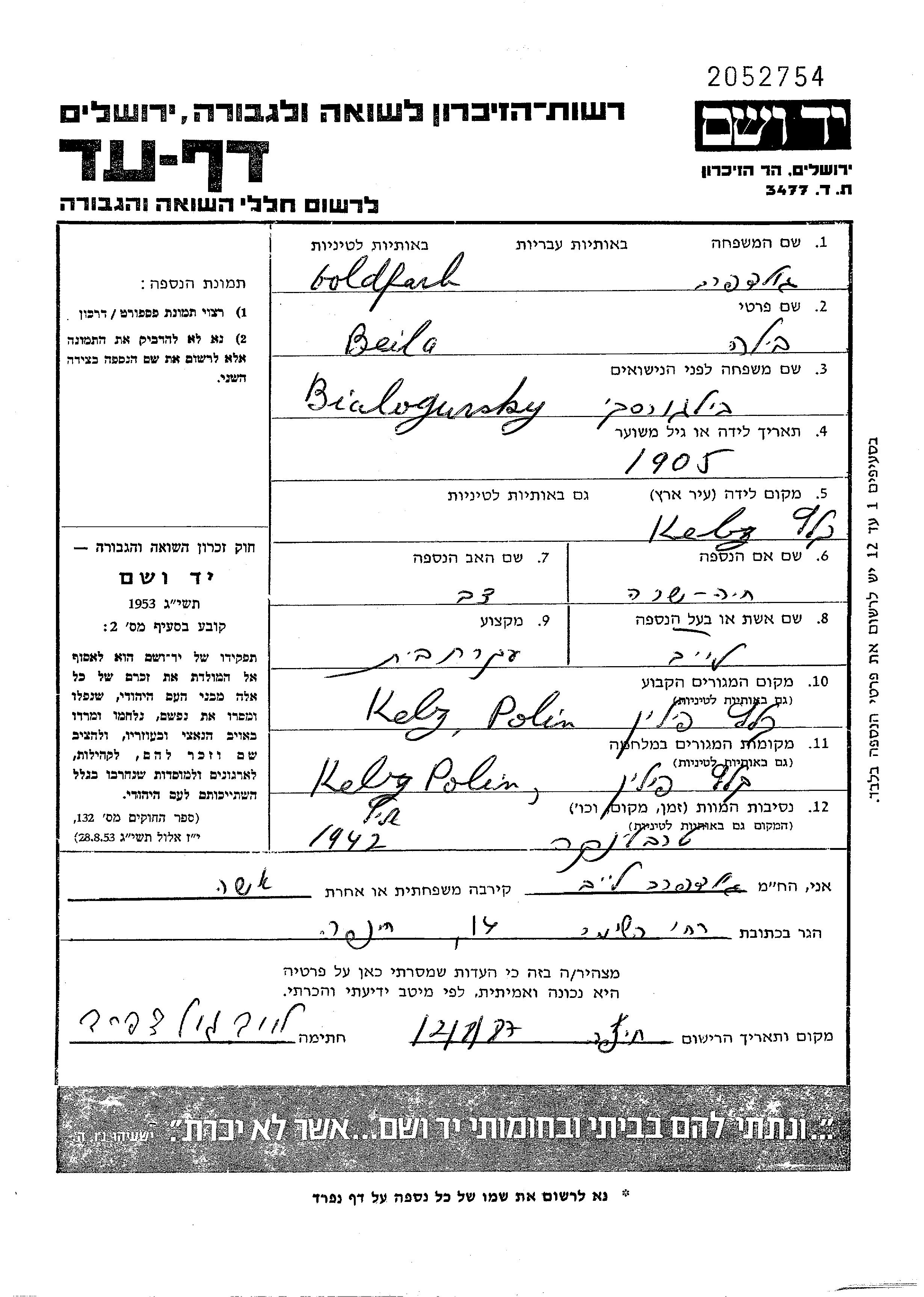 Beila Goldfarb, geb. Bialogursky wurde im Jahr 1905 in Kielce, Polen geboren. Sie war die Tochter von Dov und Khaia Sara. Sie war Hausfrau und mit Leibus Verheiratet. Vor dem Zweiten Weltkrieg lebte sie in Kielce, Polen. Während des Krieges war sie in Kielce, Polen.