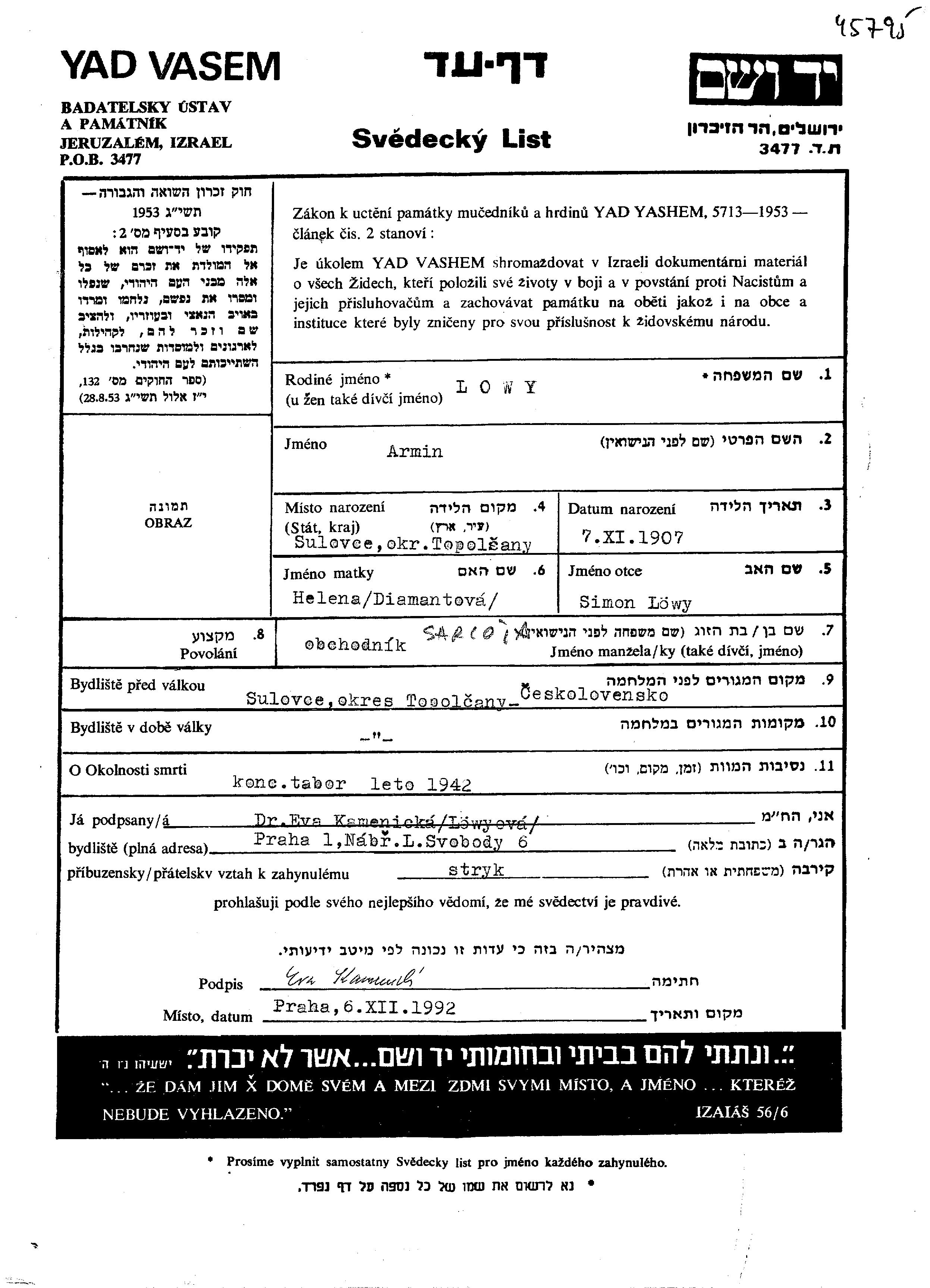 Armin Lowy wurde im Jahr 1907 in Sulovce, Tschechoslowakei geboren. Er war der Sohn von Simon und Helena, geb. Diamant. Er war Kaufmann/-frau und mit Sarlota Verheiratet. Vor dem Zweiten Weltkrieg lebte er in Sulovce, Tschechoslowakei. Während des Krieges war er in Sulovce, Tschechoslowakei.