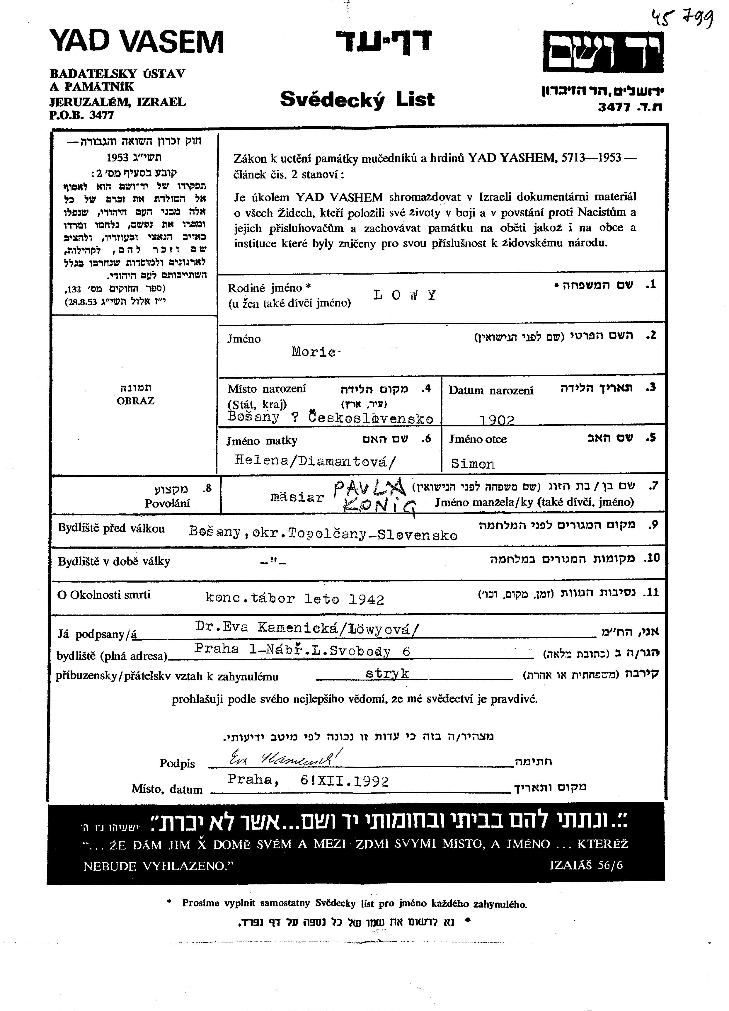 Moric Lowy wurde im Jahr 1902 in Bosany, Tschechoslowakei geboren. Er war der Sohn von Simon und Helena, geb. Diamant. Er war Metzger/-in und mit Paul Paula Verheiratet. Vor dem Zweiten Weltkrieg lebte er in Bosany, Tschechoslowakei. Während des Krieges war er in Bosany, Tschechoslowakei.