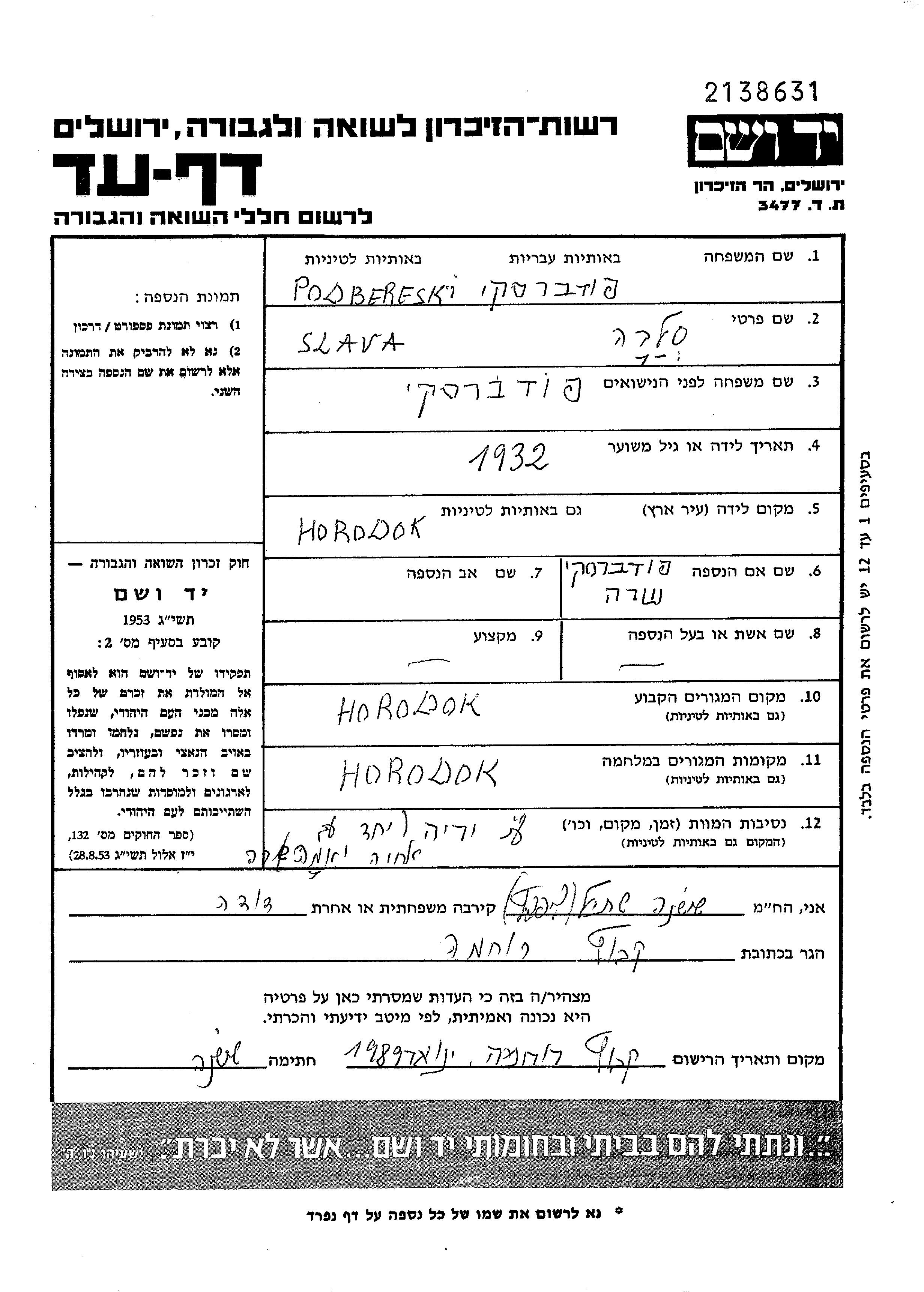 Slava Podbereski wurde in Horodek, Polen geboren. Sie war die Tochter von Khaim und Sarah, geb. Lifshitz. Sie war Kind. Vor dem Zweiten Weltkrieg lebte sie in Horodek, Polen. Während des Krieges war sie in Horodek, Polen.