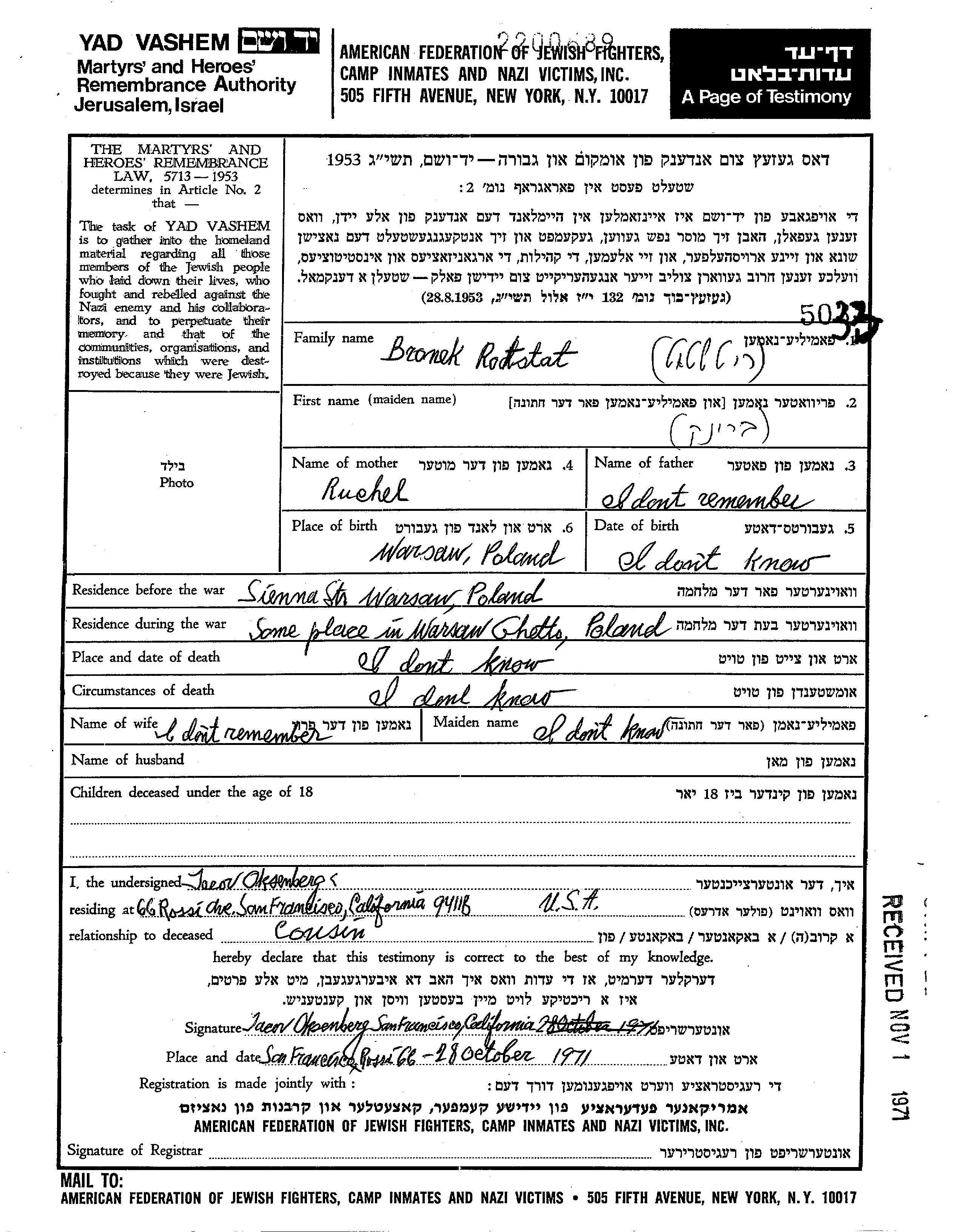 Bronek Rotstat wurde in Warszawa, Polen geboren. Er war der Sohn von Ruchel. Er war Verheiratet. Vor dem Zweiten Weltkrieg lebte er in Warszawa, Polen. Während des Krieges war er in Warszawa, Polen.