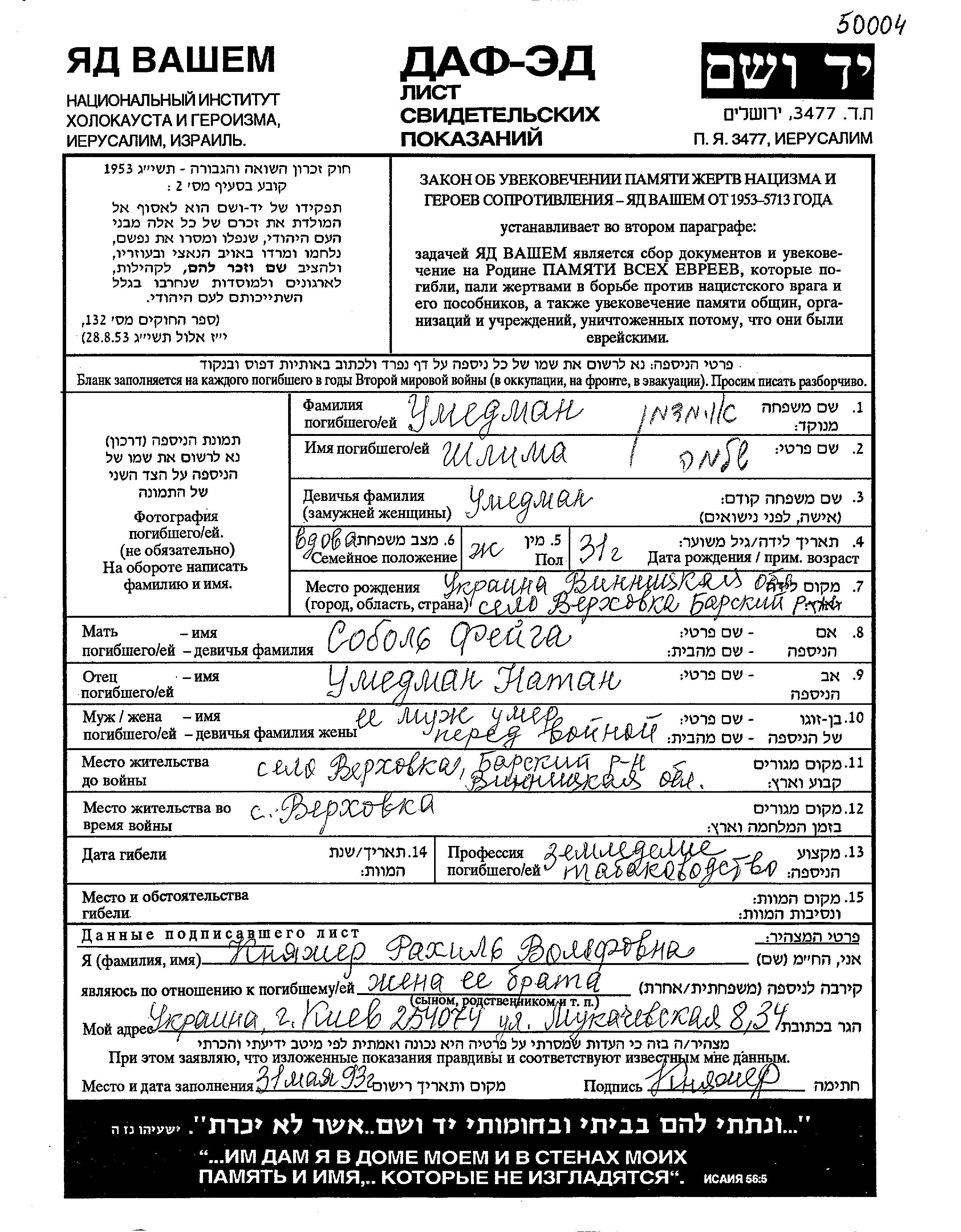 Shlima Umedman wurde in Verkhovka, Ukraine (UdSSR) geboren. Sie war die Tochter von Natan und Feiga, geb. Sobol. Sie war Landwirt und Verwitwet. Vor dem Zweiten Weltkrieg lebte sie in Verkhovka, Ukraine (UdSSR). Während des Krieges war sie in Verkhovka, Ukraine (UdSSR).