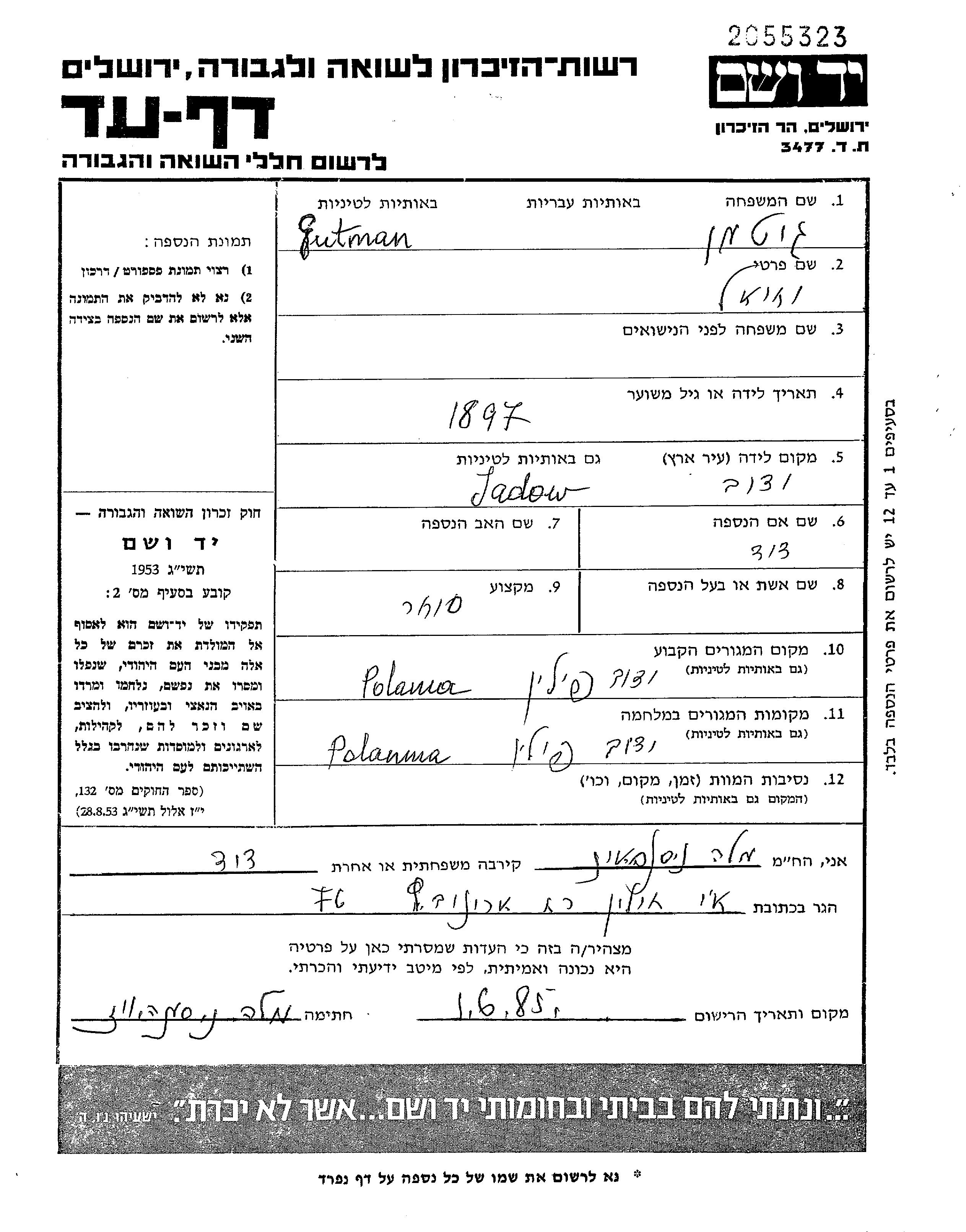 Yekhiel Gutman wurde im Jahr 1897 in Jadow, Polen geboren. Er war der Sohn von David. Er war Kaufmann/-frau. Vor dem Zweiten Weltkrieg lebte er in Jadow, Polen. Während des Krieges war er in Jadow, Polen.