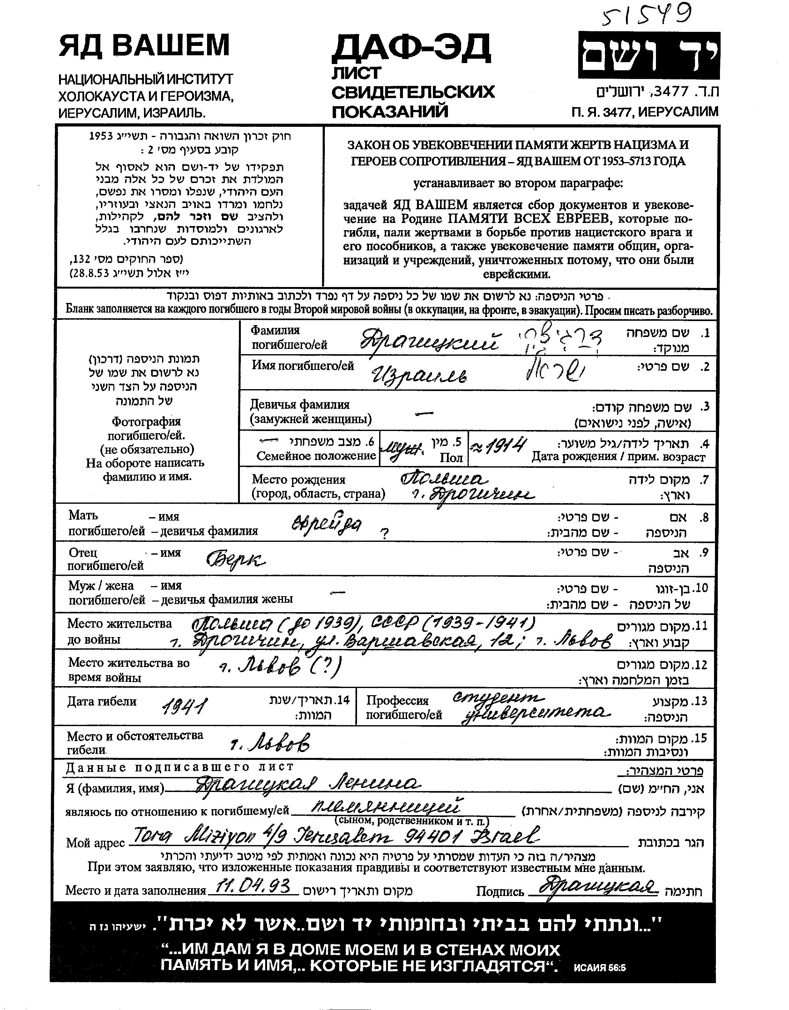 Izrail wurde in der Schoah ermordet. Todesort: Lwow, Polen im Jahr 1941.