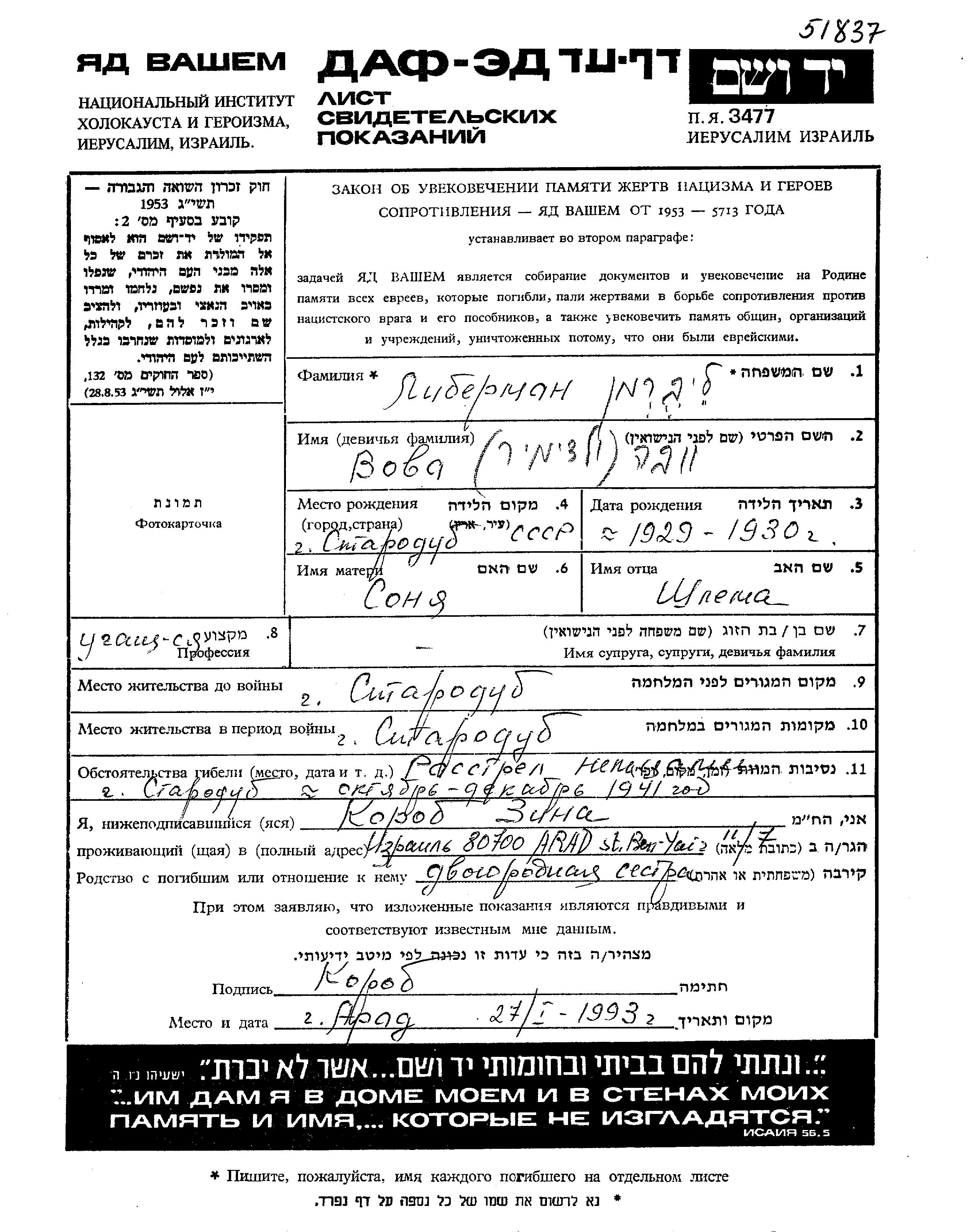 Vova wurde in der Schoah ermordet. Todesort: Starodub, Russland (UdSSR) im Jahr 1941.