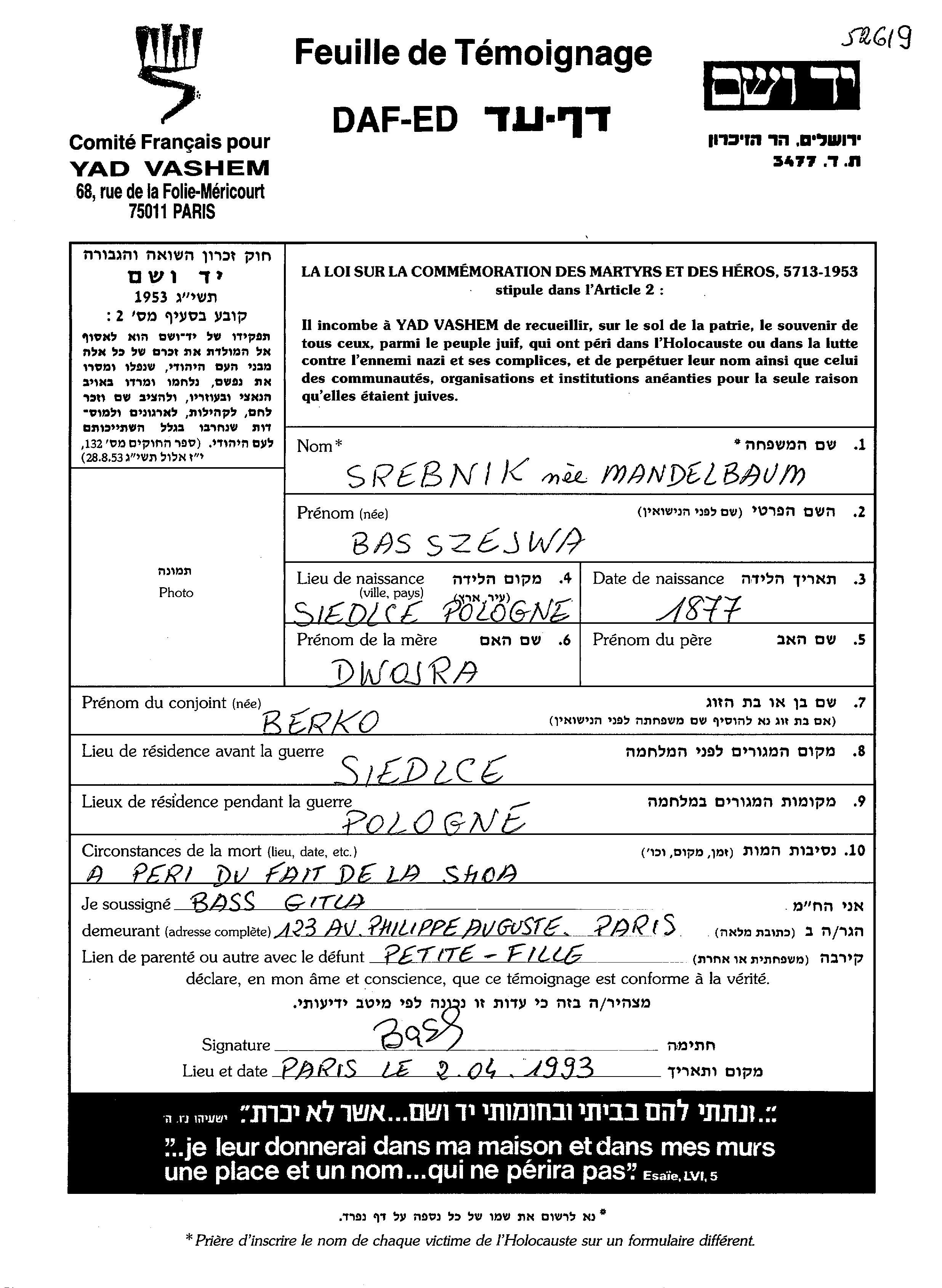 Baszejwa Srebnik, geb. Mandelbaum wurde im Jahr 1877 in Siedlce, Polen geboren. Sie war die Tochter von Dwojra. Sie war mit Berko Verheiratet. Vor dem Zweiten Weltkrieg lebte sie in Siedlce, Polen. Während des Krieges war sie in Polen.