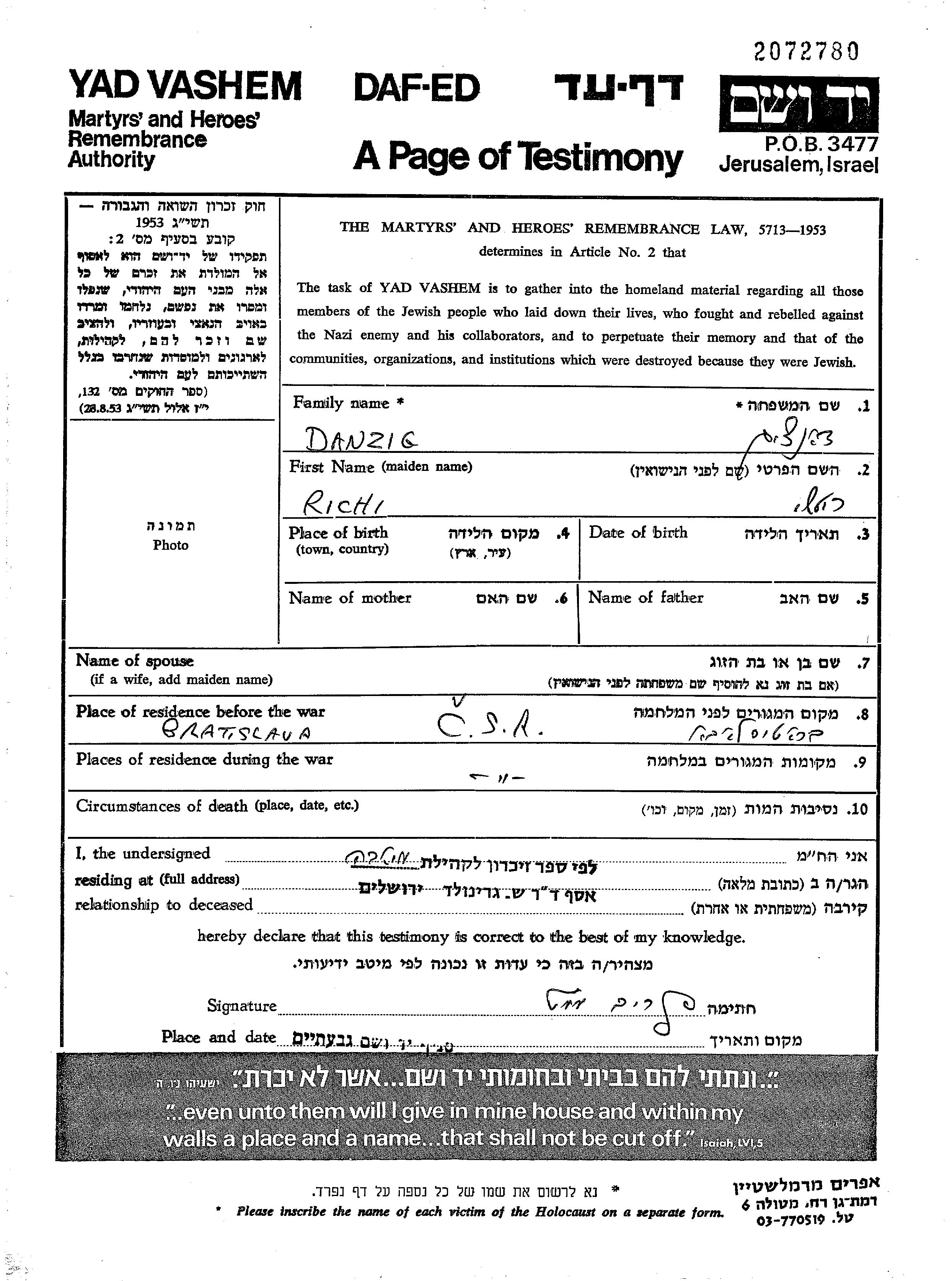 Richi Ritzi Danzig. Vor dem Zweiten Weltkrieg lebte sie in Bratislava, Tschechoslowakei. Während des Krieges war sie in Bratislava, Tschechoslowakei.