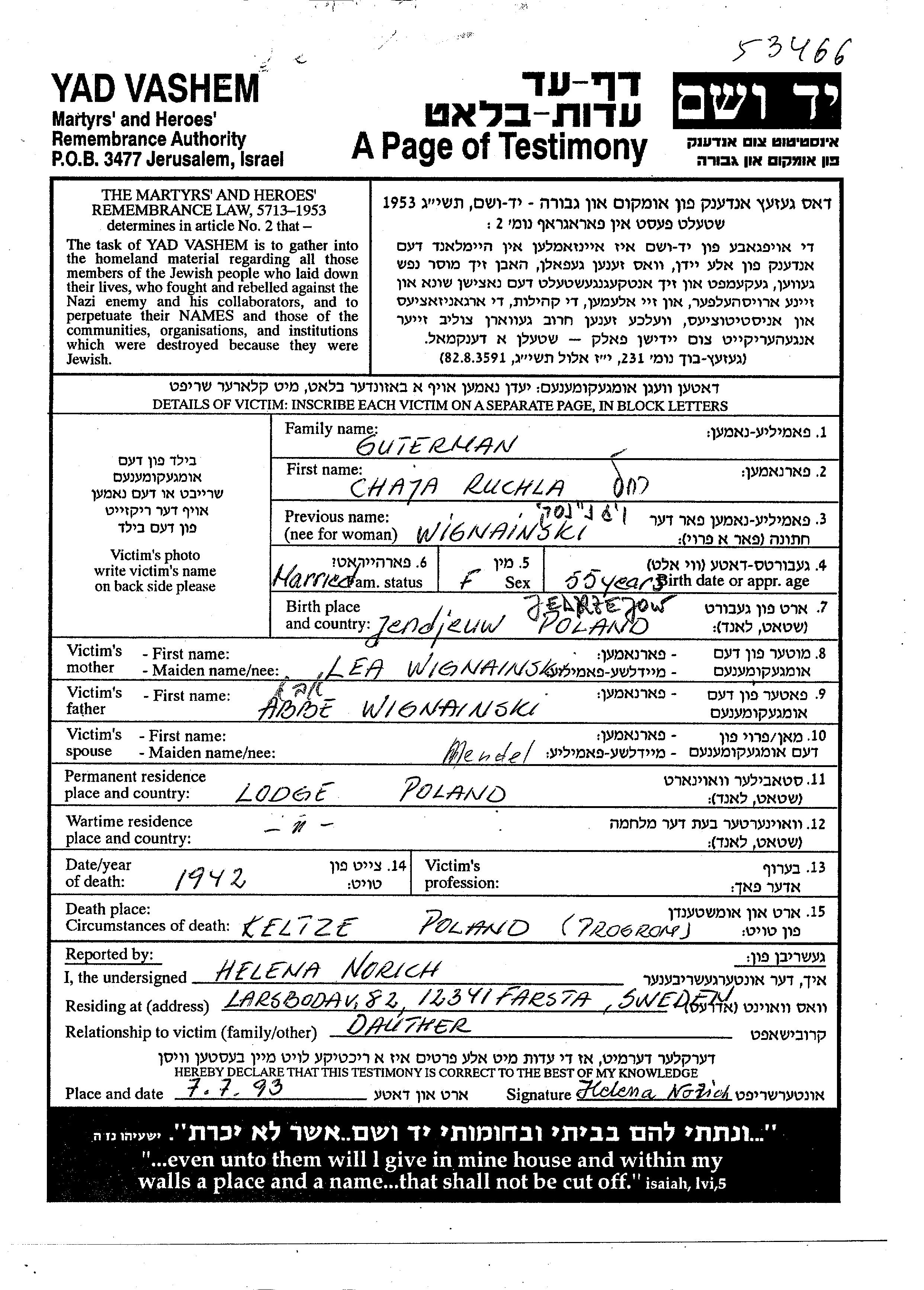 Chaja Ruchla Guterman, geb. Wignainski wurde in Jedrzejow, Polen geboren. Sie war die Tochter von Abbe und Lea. Sie war mit Mendel Verheiratet. Vor dem Zweiten Weltkrieg lebte sie in Lodz, Polen. Während des Krieges war sie in Lodz, Polen.