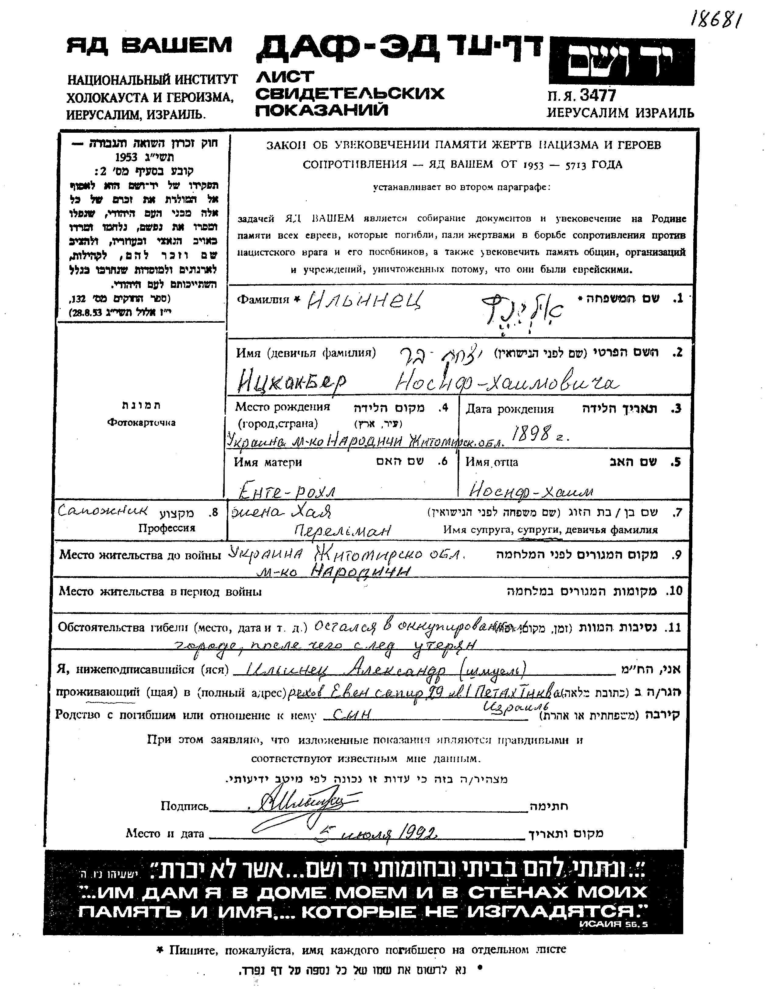 Ilyinetz Yitzkhak Ber 1898 Narodichi, Ukraine (UdSSR) Gedenkblatt