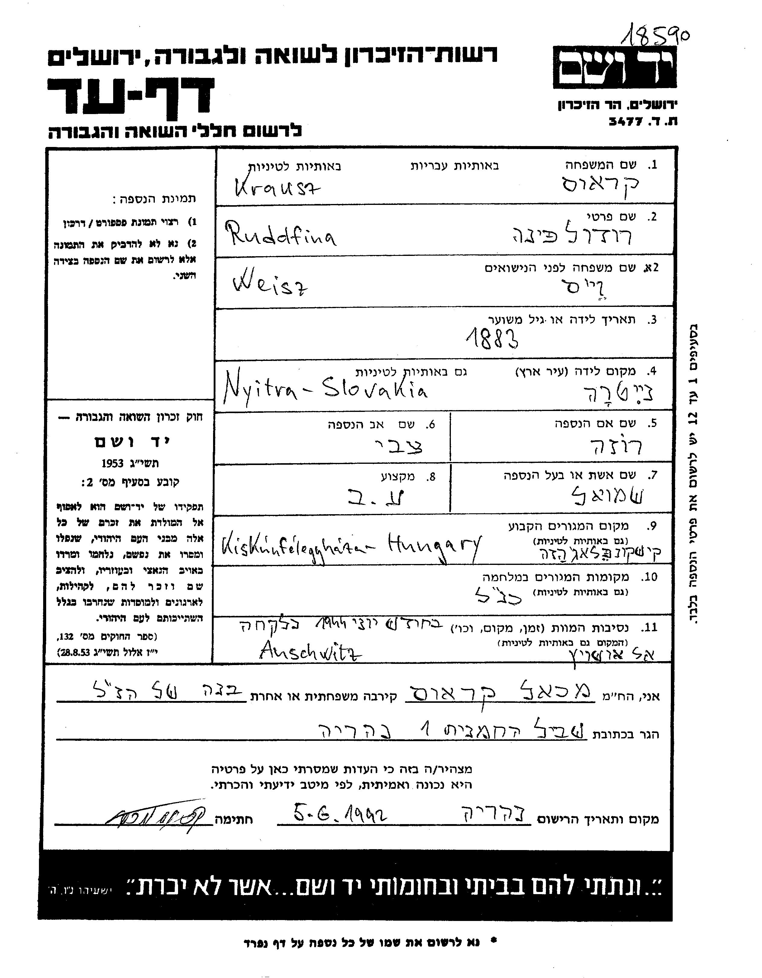 Rudolfina Krausz, geb. Weisz wurde im Jahr 1883 in Nyitra, Tschechoslowakei geboren. Sie war die Tochter von Tzvi und Rosa. Sie war Hausfrau und mit Shmuel Verheiratet. Vor dem Zweiten Weltkrieg lebte sie in Kiskunfelegyhaza, Ungarn. Während des Krieges war sie in Kiskunfelegyhaza, Ungarn.