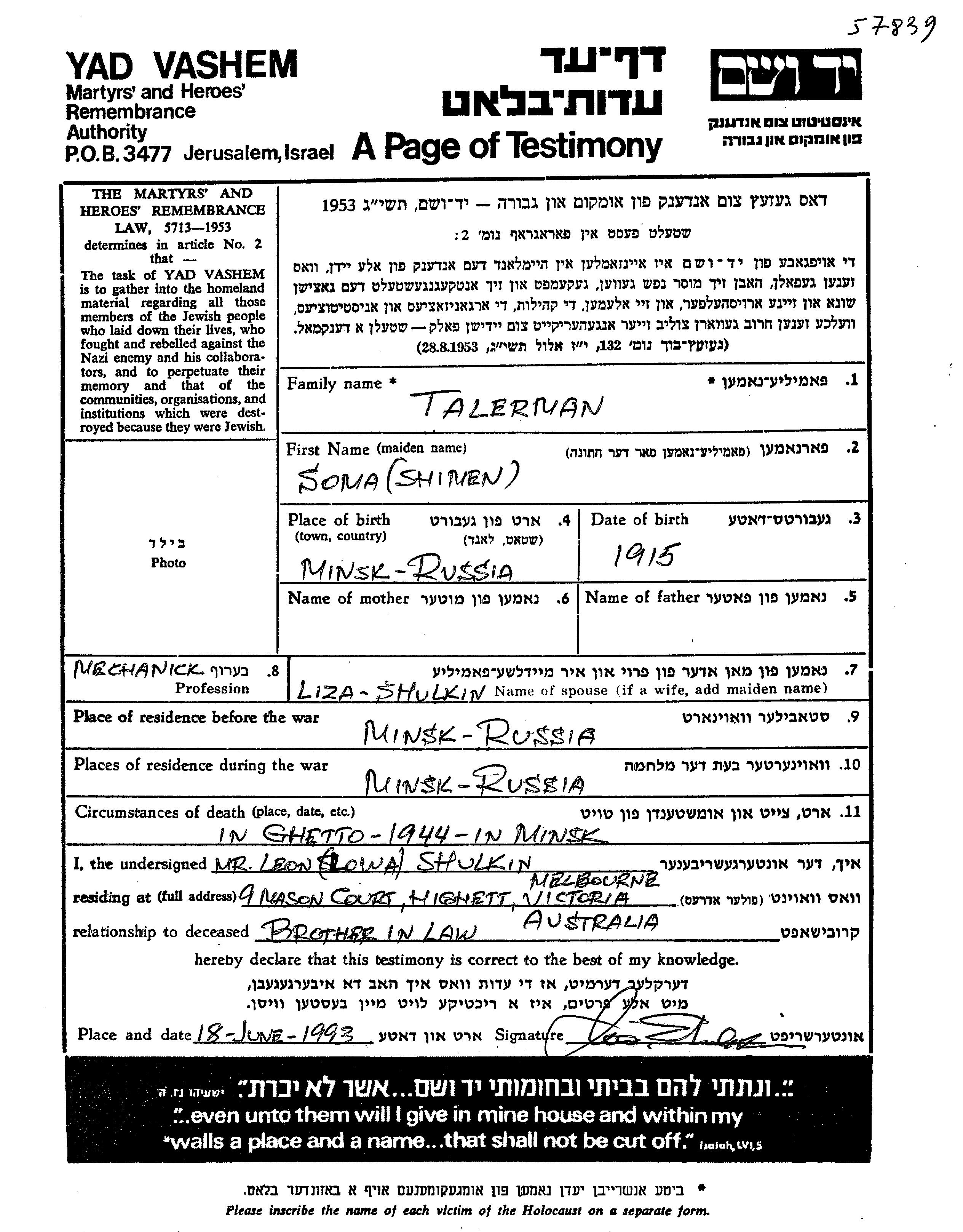 Soma Shamai Talerman wurde im Jahr 1915 in Minsk, Weißrussland (UdSSR) geboren. Er war Mechaniker/-in und mit Liza, geb. Shulkin Verheiratet. Vor dem Zweiten Weltkrieg lebte er in Minsk, Weißrussland (UdSSR). Während des Krieges war er in Minsk, Weißrussland (UdSSR).