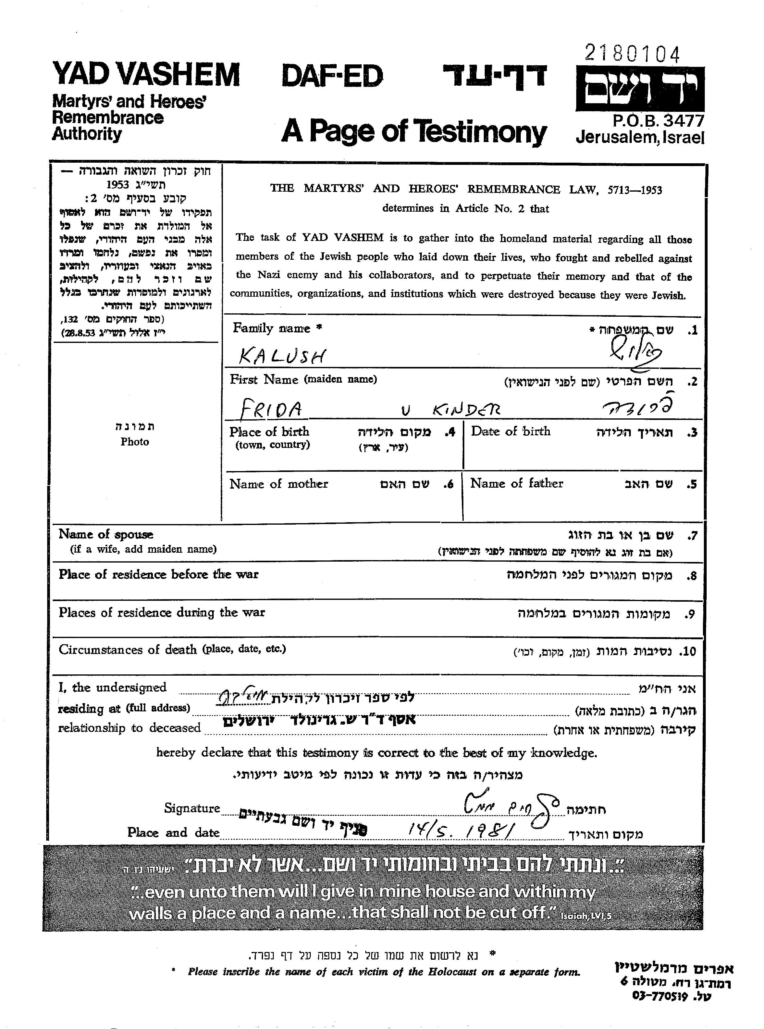 Frida Kalush wurde in Slovakia, Tschechoslowakei geboren.