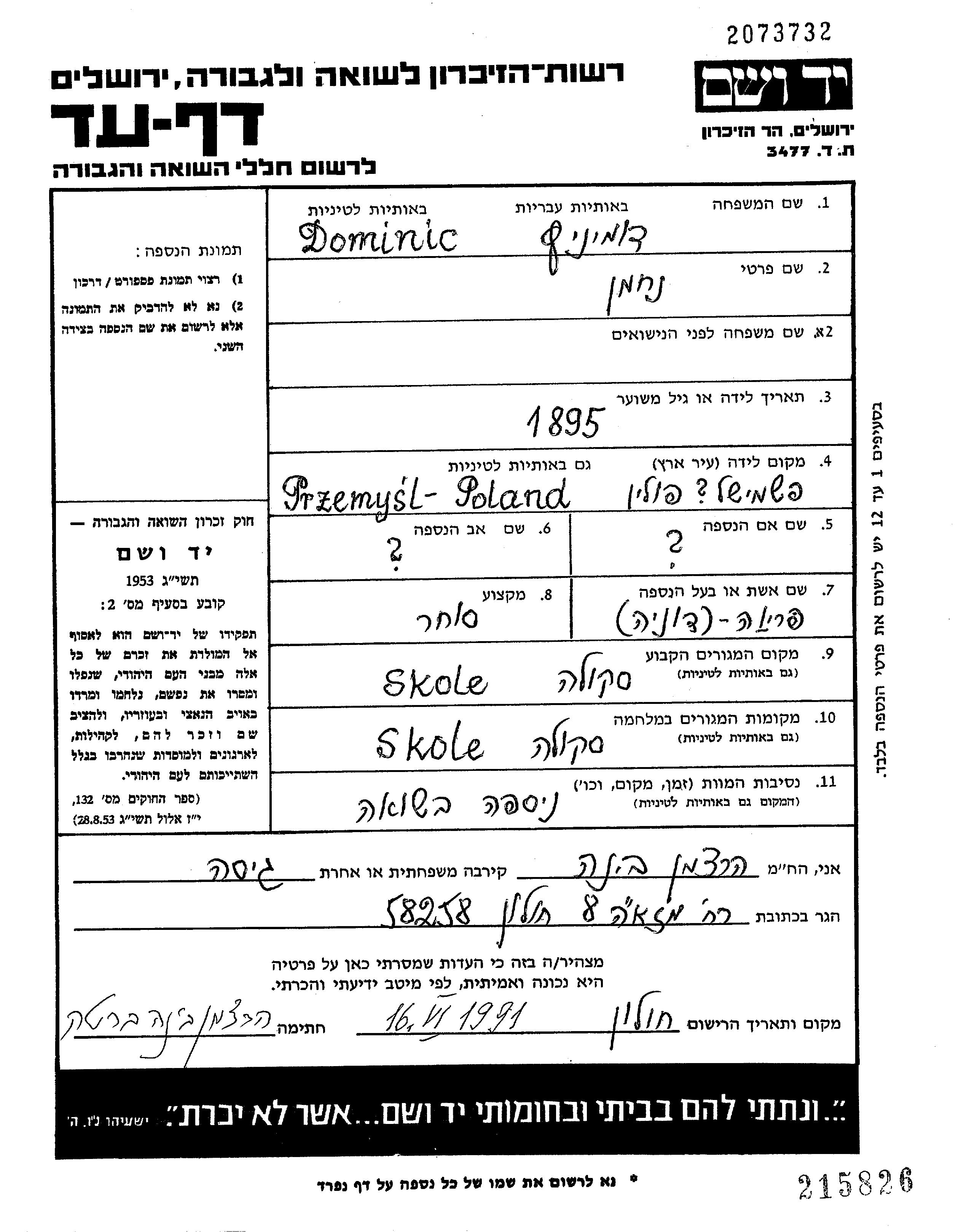 Nakhman Dominic. Er war mit Dunia Priva Donia Verheiratet. Vor dem Zweiten Weltkrieg lebte er in Skole, Polen. Während des Krieges war er in Skole, Polen.